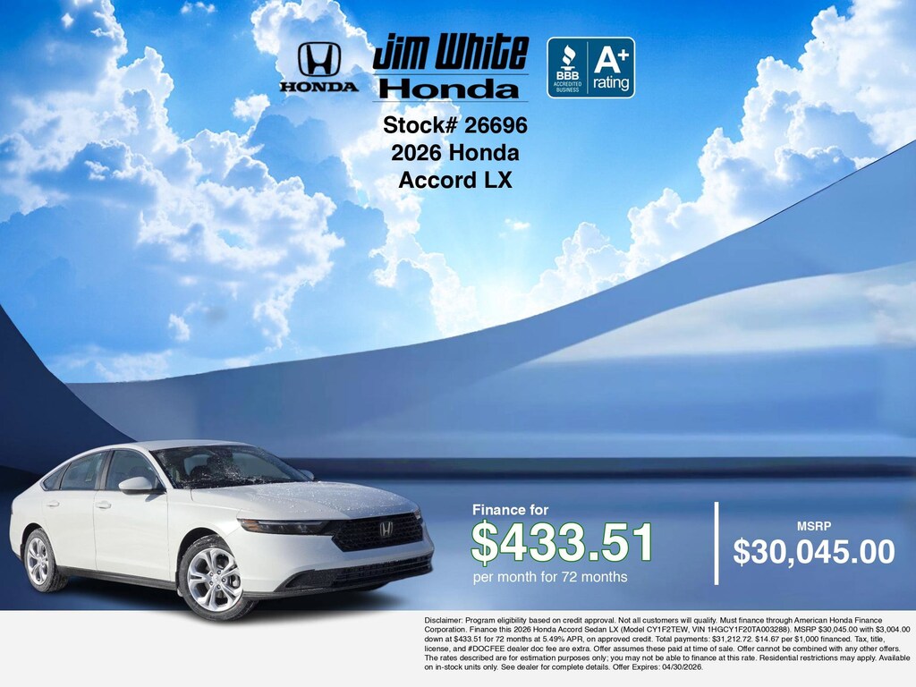 Our car payment calculator and estimator tools can help you understand these finance offers that leverage the benefits of Honda Financial Services, along with Honda vehicle incentives right now and current Honda Accord LX specials. Additionally, we offer 4 other Accord LX options for the best selection in Maumee. Call or drive in for Honda finance deals you can drive home today! Disclaimer: Disclaimer: Program eligibility based on credit approval. Not all customers will qualify. Must finance through American Honda Finance Corporation. Finance this 2026 Honda Accord Sedan LX (Model CY1F2TEW, VIN 1HGCY1F20TA003288). MSRP $30,045.00 with $3,004.00 down at $433.51 for 72 months at 5.49% APR, on approved credit. Total payments: $31,212.72. $14.67 per $1,000 financed. Tax, title, license, and #DOCFEE dealer doc fee are extra. Offer assumes these paid at time of sale. Offer cannot be combined with any other offers. The rates described are for estimation purposes only; you may not be able to finance at this rate. Residential restrictions may apply. Available on in-stock units only. See dealer for complete details. Offer Expires: 04/30/2026.