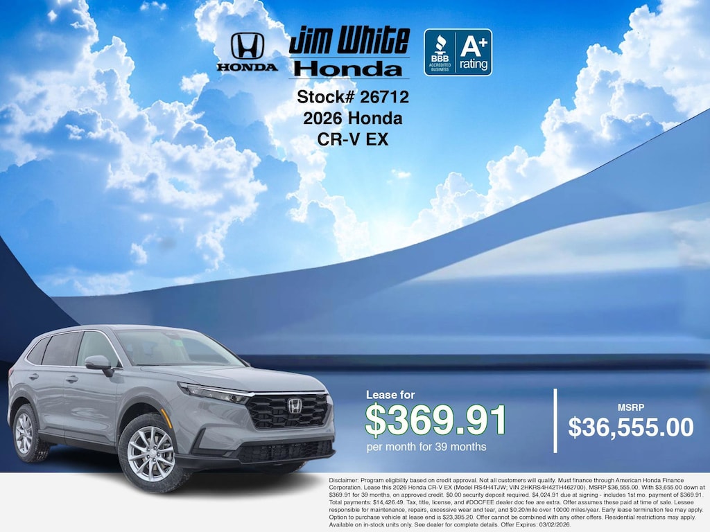 These offers leverage the benefits of Honda Financial Services, along with current Honda incentives, Honda CR-V EX specials, and tax incentives available on electric vehicles. Additionally, we offer 5 other CR-V EX options for the best selection in Maumee. Call or drive in for competitive Honda lease offers you can drive home today, like this stunning 2026 Honda CR-V with lease options near Maumee! This CR-V is also available for sale near Toledo, Perrysburg, and Waterville. These Honda lease specials end 3/2/2026 Disclaimer: Disclaimer: Program eligibility based on credit approval. Not all customers will qualify. Must finance through American Honda Finance Corporation. Lease this 2026 Honda CR-V EX (Model RS4H4TJW; VIN 2HKRS4H42TH462700). MSRP $36,555.00. With $3,655.00 down at $369.91 for 39 months, on approved credit. $0.00 security deposit required. $4,024.91 due at signing - includes 1st mo. payment of $369.91. Total payments: $14,426.49. Tax, title, license, and #DOCFEE dealer doc fee are extra. Offer assumes these paid at time of sale. Lessee responsible for maintenance, repairs, excessive wear and tear, and $0.20/mile over 10000 miles/year. Early lease termination fee may apply. Option to purchase vehicle at lease end is $23,395.20. Offer cannot be combined with any other offers. Residential restrictions may apply. Available on in-stock units only. See dealer for complete details. Offer Expires: 03/02/2026.