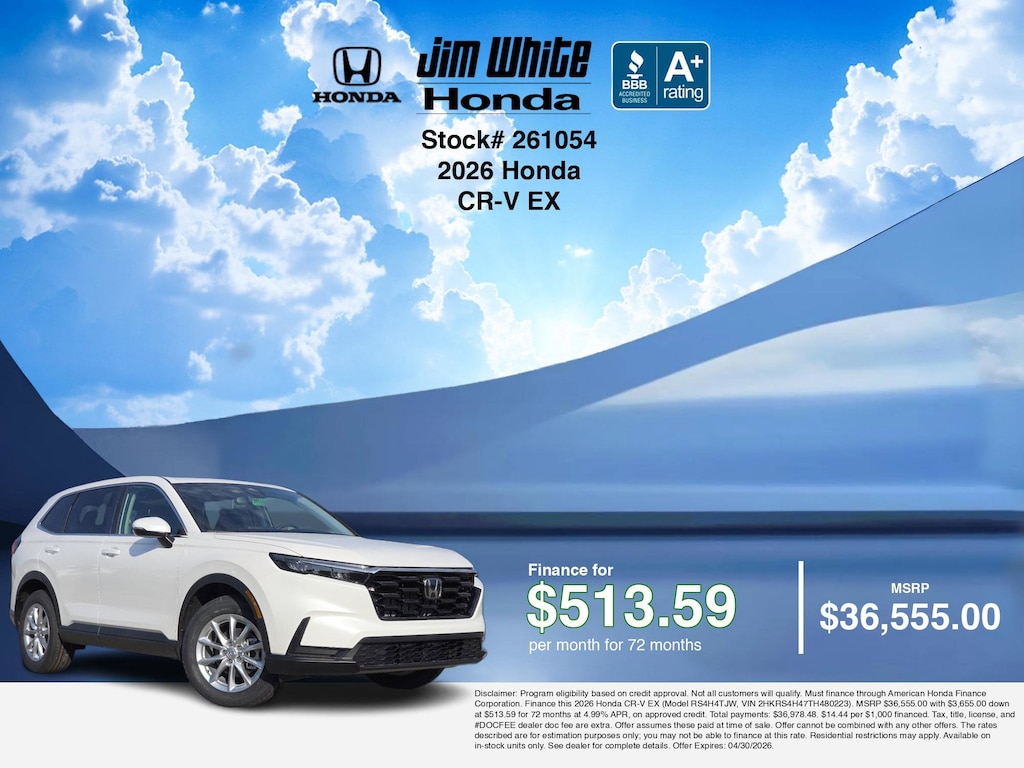 If you are ready to finance a new Honda near Maumee, Toledo, Perrysburg, and Waterville, Jim White Honda is thrilled to offer you competitive finance deals on this 2026 Honda CR-V EX. Here is how the monthly payment of $513.59 is calculated for well-qualified buyers shopping Jim White Honda with Tier 1 credit (use our car loan payment calculator or monthly car payment calculator for estimates):