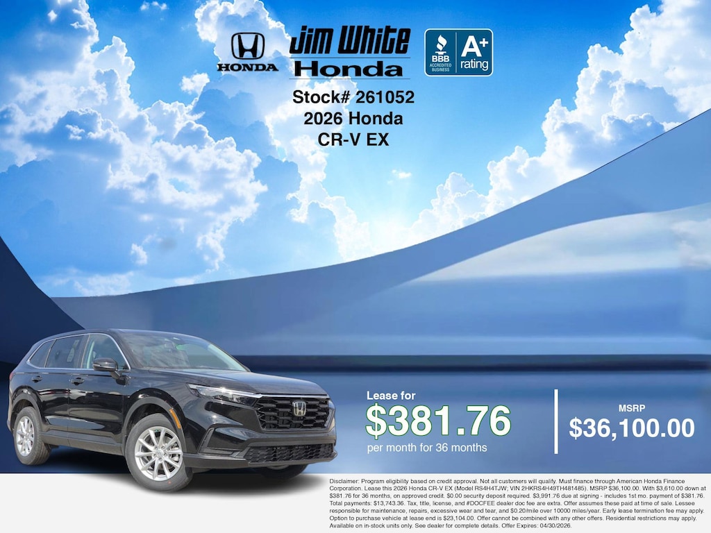 These offers leverage the benefits of Honda Financial Services, along with current Honda incentives, Honda CR-V EX specials, and tax incentives available on electric vehicles. Additionally, we offer 15 other CR-V EX options for the best selection in Maumee. Call or drive in for competitive Honda lease offers you can drive home today, like this stunning 2026 Honda CR-V with lease options near Maumee! This CR-V is also available for sale near Toledo, Perrysburg, and Waterville. These Honda lease specials end 4/30/2026 Disclaimer: Disclaimer: Program eligibility based on credit approval. Not all customers will qualify. Must finance through American Honda Finance Corporation. Lease this 2026 Honda CR-V EX (Model RS4H4TJW; VIN 2HKRS4H49TH481485). MSRP $36,100.00. With $3,610.00 down at $381.76 for 36 months, on approved credit. $0.00 security deposit required. $3,991.76 due at signing - includes 1st mo. payment of $381.76. Total payments: $13,743.36. Tax, title, license, and #DOCFEE dealer doc fee are extra. Offer assumes these paid at time of sale. Lessee responsible for maintenance, repairs, excessive wear and tear, and $0.20/mile over 10000 miles/year. Early lease termination fee may apply. Option to purchase vehicle at lease end is $23,104.00. Offer cannot be combined with any other offers. Residential restrictions may apply. Available on in-stock units only. See dealer for complete details. Offer Expires: 04/30/2026.