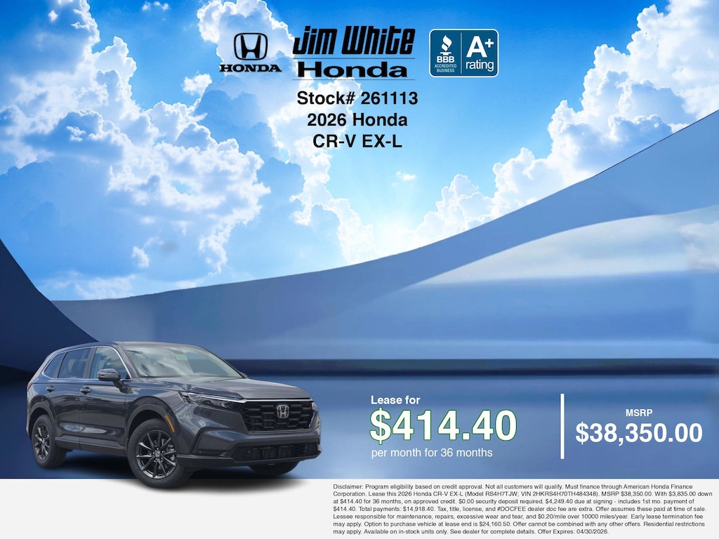These offers leverage the benefits of Honda Financial Services, along with current Honda incentives, Honda CR-V EX-L specials, and tax incentives available on electric vehicles. Additionally, we offer 22 other CR-V EX-L options for the best selection in Maumee. Call or drive in for competitive Honda lease offers you can drive home today, like this stunning 2026 Honda CR-V with lease options near Maumee! This CR-V is also available for sale near Toledo, Perrysburg, and Waterville. These Honda lease specials end 4/30/2026 Disclaimer: Disclaimer: Program eligibility based on credit approval. Not all customers will qualify. Must finance through American Honda Finance Corporation. Lease this 2026 Honda CR-V EX-L (Model RS4H7TJW; VIN 2HKRS4H70TH484348). MSRP $38,350.00. With $3,835.00 down at $414.40 for 36 months, on approved credit. $0.00 security deposit required. $4,249.40 due at signing - includes 1st mo. payment of $414.40. Total payments: $14,918.40. Tax, title, license, and #DOCFEE dealer doc fee are extra. Offer assumes these paid at time of sale. Lessee responsible for maintenance, repairs, excessive wear and tear, and $0.20/mile over 10000 miles/year. Early lease termination fee may apply. Option to purchase vehicle at lease end is $24,160.50. Offer cannot be combined with any other offers. Residential restrictions may apply. Available on in-stock units only. See dealer for complete details. Offer Expires: 04/30/2026.