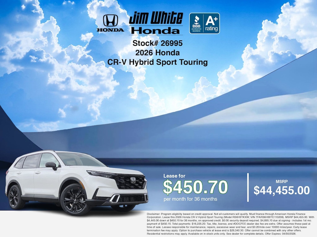 These offers leverage the benefits of Honda Financial Services, along with current Honda incentives, Honda CR-V Hybrid Sport Touring specials, and tax incentives available on electric vehicles. Additionally, we offer 8 other CR-V Hybrid Sport Touring options for the best selection in Maumee. Call or drive in for competitive Honda lease offers you can drive home today, like this stunning 2026 Honda CR-V Hybrid with lease options near Maumee! This CR-V Hybrid is also available for sale near Toledo, Perrysburg, and Waterville. These Honda lease specials end 4/30/2026 Disclaimer: Disclaimer: Program eligibility based on credit approval. Not all customers will qualify. Must finance through American Honda Finance Corporation. Lease this 2026 Honda CR-V Hybrid Sport Touring (Model RS6H9TKXW; VIN 7FARS6H90TE110208). MSRP $44,455.00. With $4,445.00 down at $450.70 for 36 months, on approved credit. $0.00 security deposit required. $4,895.70 due at signing - includes 1st mo. payment of $450.70. Total payments: $16,225.20. Tax, title, license, and #DOCFEE dealer doc fee are extra. Offer assumes these paid at time of sale. Lessee responsible for maintenance, repairs, excessive wear and tear, and $0.20/mile over 10000 miles/year. Early lease termination fee may apply. Option to purchase vehicle at lease end is $29,340.30. Offer cannot be combined with any other offers. Residential restrictions may apply. Available on in-stock units only. See dealer for complete details. Offer Expires: 04/30/2026.