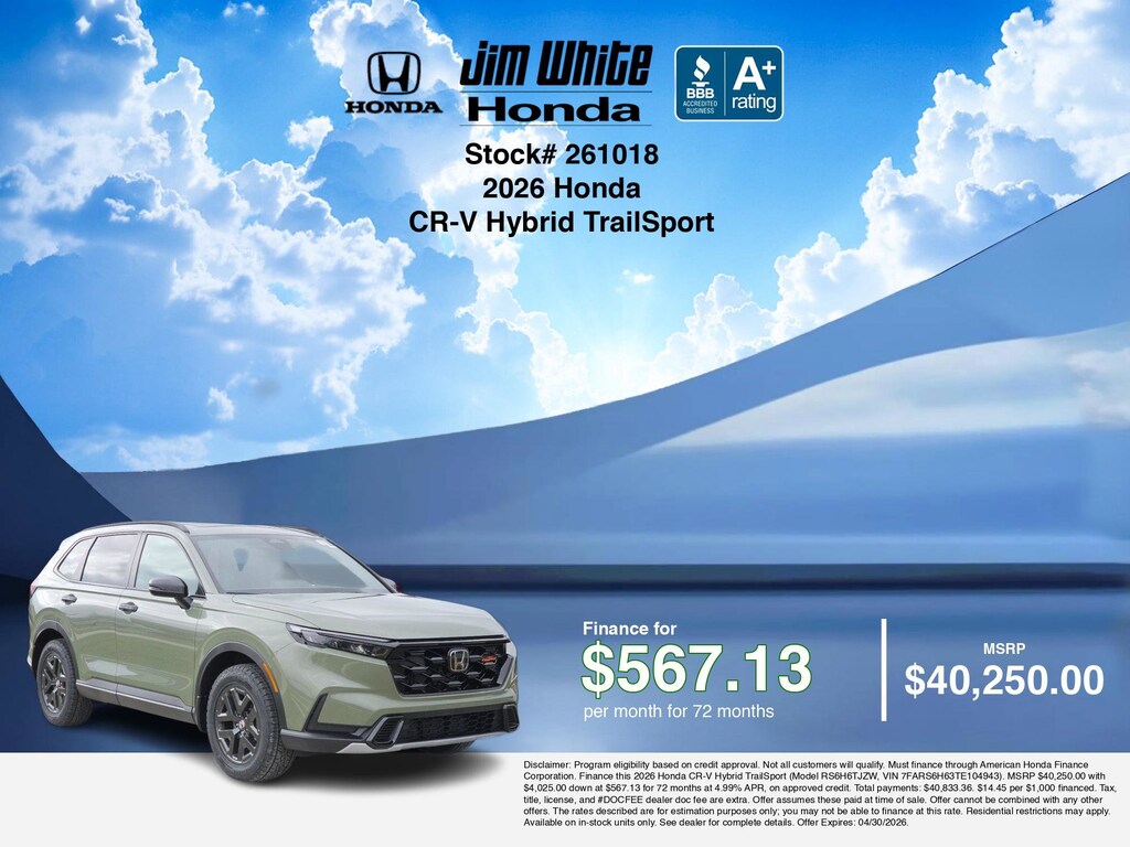 Our car payment calculator and estimator tools can help you understand these finance offers that leverage the benefits of Honda Financial Services, along with Honda vehicle incentives right now and current Honda CR-V Hybrid TrailSport specials. Additionally, we offer 2 other CR-V Hybrid TrailSport options for the best selection in Maumee. Call or drive in for Honda finance deals you can drive home today! Disclaimer: Disclaimer: Program eligibility based on credit approval. Not all customers will qualify. Must finance through American Honda Finance Corporation. Finance this 2026 Honda CR-V Hybrid TrailSport (Model RS6H6TJZW, VIN 7FARS6H63TE104943). MSRP $40,250.00 with $4,025.00 down at $567.13 for 72 months at 4.99% APR, on approved credit. Total payments: $40,833.36. $14.45 per $1,000 financed. Tax, title, license, and #DOCFEE dealer doc fee are extra. Offer assumes these paid at time of sale. Offer cannot be combined with any other offers. The rates described are for estimation purposes only; you may not be able to finance at this rate. Residential restrictions may apply. Available on in-stock units only. See dealer for complete details. Offer Expires: 04/30/2026.