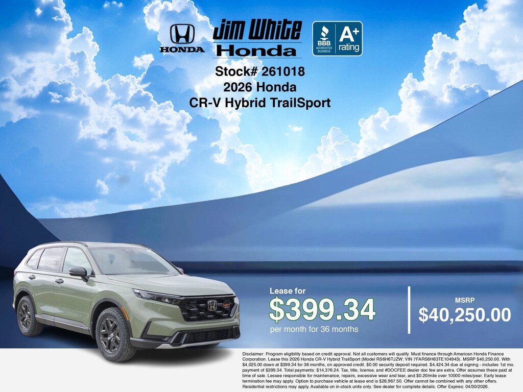These offers leverage the benefits of Honda Financial Services, along with current Honda incentives, Honda CR-V Hybrid TrailSport specials, and tax incentives available on electric vehicles. Additionally, we offer 2 other CR-V Hybrid TrailSport options for the best selection in Maumee. Call or drive in for competitive Honda lease offers you can drive home today, like this stunning 2026 Honda CR-V Hybrid with lease options near Maumee! This CR-V Hybrid is also available for sale near Toledo, Perrysburg, and Waterville. These Honda lease specials end 4/30/2026 Disclaimer: Disclaimer: Program eligibility based on credit approval. Not all customers will qualify. Must finance through American Honda Finance Corporation. Lease this 2026 Honda CR-V Hybrid TrailSport (Model RS6H6TJZW; VIN 7FARS6H63TE104943). MSRP $40,250.00. With $4,025.00 down at $399.34 for 36 months, on approved credit. $0.00 security deposit required. $4,424.34 due at signing - includes 1st mo. payment of $399.34. Total payments: $14,376.24. Tax, title, license, and #DOCFEE dealer doc fee are extra. Offer assumes these paid at time of sale. Lessee responsible for maintenance, repairs, excessive wear and tear, and $0.20/mile over 10000 miles/year. Early lease termination fee may apply. Option to purchase vehicle at lease end is $26,967.50. Offer cannot be combined with any other offers. Residential restrictions may apply. Available on in-stock units only. See dealer for complete details. Offer Expires: 04/30/2026.