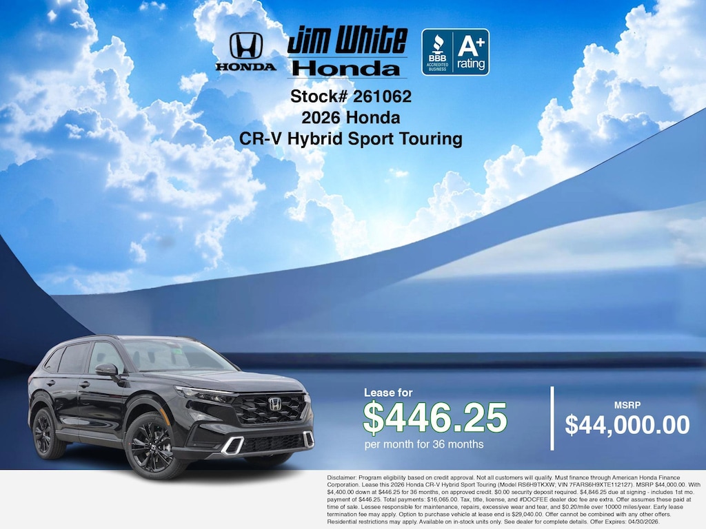 These offers leverage the benefits of Honda Financial Services, along with current Honda incentives, Honda CR-V Hybrid Sport Touring specials, and tax incentives available on electric vehicles. Additionally, we offer 5 other CR-V Hybrid Sport Touring options for the best selection in Maumee. Call or drive in for competitive Honda lease offers you can drive home today, like this stunning 2026 Honda CR-V Hybrid with lease options near Maumee! This CR-V Hybrid is also available for sale near Toledo, Perrysburg, and Waterville. These Honda lease specials end 4/30/2026 Disclaimer: Disclaimer: Program eligibility based on credit approval. Not all customers will qualify. Must finance through American Honda Finance Corporation. Lease this 2026 Honda CR-V Hybrid Sport Touring (Model RS6H9TKXW; VIN 7FARS6H9XTE112127). MSRP $44,000.00. With $4,400.00 down at $446.25 for 36 months, on approved credit. $0.00 security deposit required. $4,846.25 due at signing - includes 1st mo. payment of $446.25. Total payments: $16,065.00. Tax, title, license, and #DOCFEE dealer doc fee are extra. Offer assumes these paid at time of sale. Lessee responsible for maintenance, repairs, excessive wear and tear, and $0.20/mile over 10000 miles/year. Early lease termination fee may apply. Option to purchase vehicle at lease end is $29,040.00. Offer cannot be combined with any other offers. Residential restrictions may apply. Available on in-stock units only. See dealer for complete details. Offer Expires: 04/30/2026.