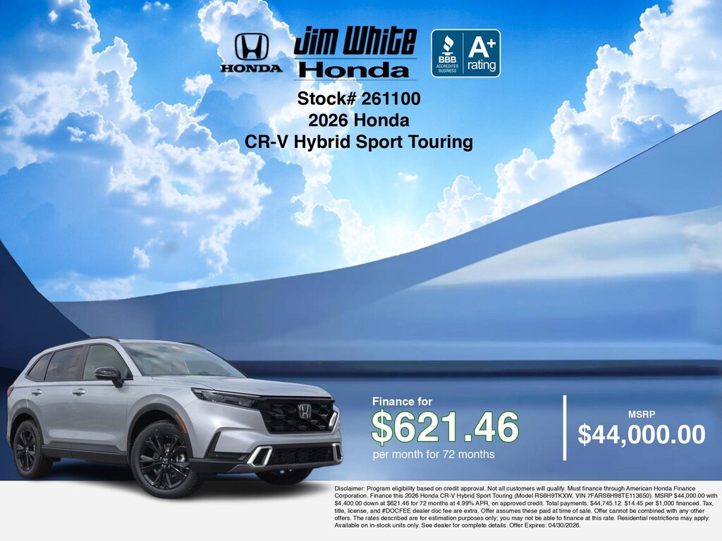 Our car payment calculator and estimator tools can help you understand these finance offers that leverage the benefits of Honda Financial Services, along with Honda vehicle incentives right now and current Honda CR-V Hybrid Sport Touring specials. Additionally, we offer 9 other CR-V Hybrid Sport Touring options for the best selection in Maumee. Call or drive in for Honda finance deals you can drive home today! Disclaimer: Disclaimer: Program eligibility based on credit approval. Not all customers will qualify. Must finance through American Honda Finance Corporation. Finance this 2026 Honda CR-V Hybrid Sport Touring (Model RS6H9TKXW, VIN 7FARS6H98TE113650). MSRP $44,000.00 with $4,400.00 down at $621.46 for 72 months at 4.99% APR, on approved credit. Total payments: $44,745.12. $14.45 per $1,000 financed. Tax, title, license, and #DOCFEE dealer doc fee are extra. Offer assumes these paid at time of sale. Offer cannot be combined with any other offers. The rates described are for estimation purposes only; you may not be able to finance at this rate. Residential restrictions may apply. Available on in-stock units only. See dealer for complete details. Offer Expires: 04/30/2026.