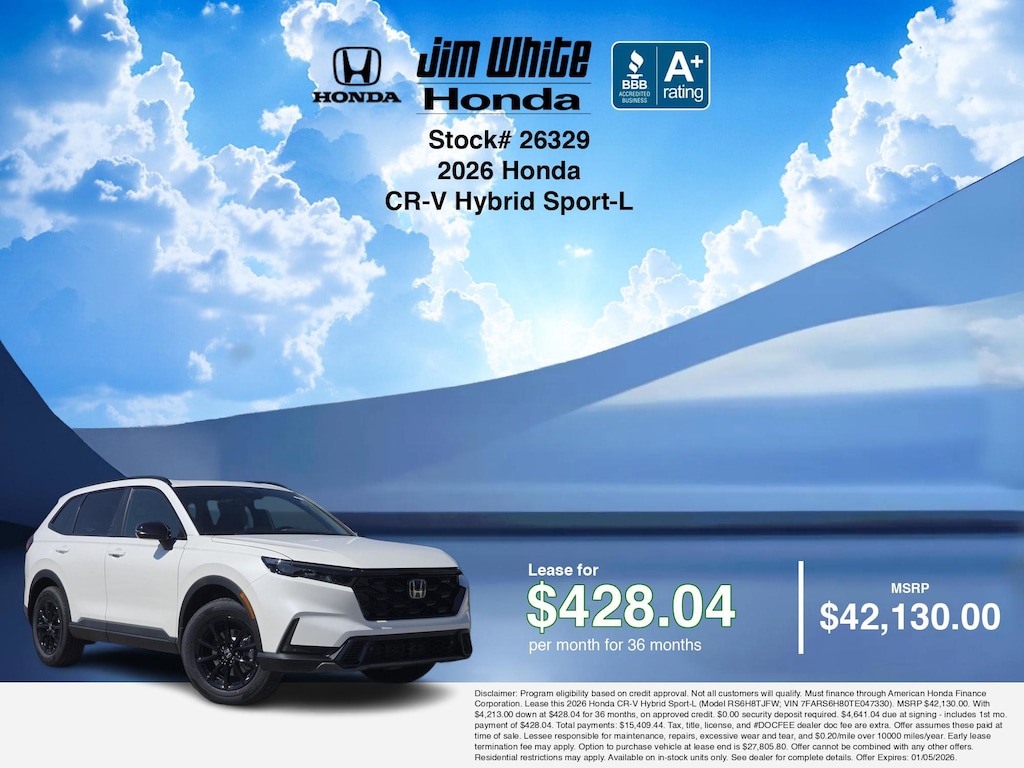 These offers leverage the benefits of Honda Financial Services, along with current Honda incentives, Honda CR-V Hybrid Sport-L specials, and tax incentives available on electric vehicles. Additionally, we offer 4 other CR-V Hybrid Sport-L options for the best selection in Maumee. Call or drive in for competitive Honda lease offers you can drive home today, like this stunning 2026 Honda CR-V Hybrid with lease options near Maumee! This CR-V Hybrid is also available for sale near Toledo, Perrysburg, and Waterville. These Honda lease specials end 1/5/2026 Disclaimer: Disclaimer: Program eligibility based on credit approval. Not all customers will qualify. Must finance through American Honda Finance Corporation. Lease this 2026 Honda CR-V Hybrid Sport-L (Model RS6H8TJFW; VIN 7FARS6H80TE047330). MSRP $42,130.00. With $4,213.00 down at $428.04 for 36 months, on approved credit. $0.00 security deposit required. $4,641.04 due at signing - includes 1st mo. payment of $428.04. Total payments: $15,409.44. Tax, title, license, and #DOCFEE dealer doc fee are extra. Offer assumes these paid at time of sale. Lessee responsible for maintenance, repairs, excessive wear and tear, and $0.20/mile over 10000 miles/year. Early lease termination fee may apply. Option to purchase vehicle at lease end is $27,805.80. Offer cannot be combined with any other offers. Residential restrictions may apply. Available on in-stock units only. See dealer for complete details. Offer Expires: 01/05/2026.