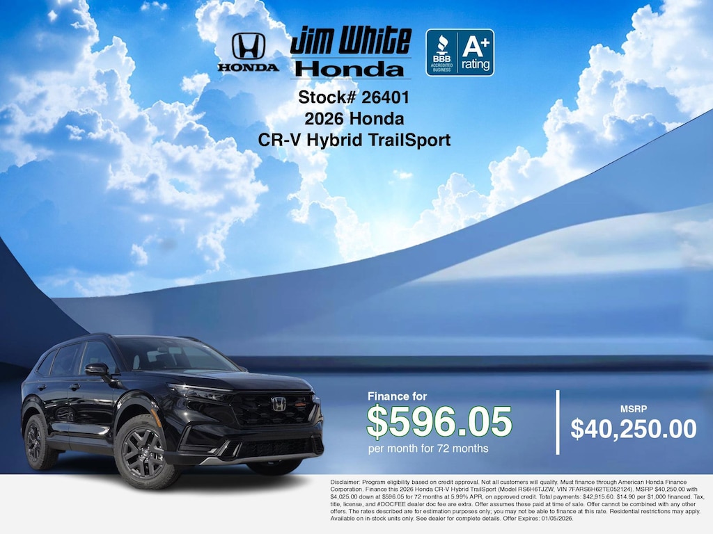 Our car payment calculator and estimator tools can help you understand these finance offers that leverage the benefits of Honda Financial Services, along with Honda vehicle incentives right now and current Honda CR-V Hybrid TrailSport specials. Additionally, we offer 5 other CR-V Hybrid TrailSport options for the best selection in Maumee. Call or drive in for Honda finance deals you can drive home today! Disclaimer: Disclaimer: Program eligibility based on credit approval. Not all customers will qualify. Must finance through American Honda Finance Corporation. Finance this 2026 Honda CR-V Hybrid TrailSport (Model RS6H6TJZW, VIN 7FARS6H62TE052124). MSRP $40,250.00 with $4,025.00 down at $596.05 for 72 months at 5.99% APR, on approved credit. Total payments: $42,915.60. $14.90 per $1,000 financed. Tax, title, license, and #DOCFEE dealer doc fee are extra. Offer assumes these paid at time of sale. Offer cannot be combined with any other offers. The rates described are for estimation purposes only; you may not be able to finance at this rate. Residential restrictions may apply. Available on in-stock units only. See dealer for complete details. Offer Expires: 01/05/2026.