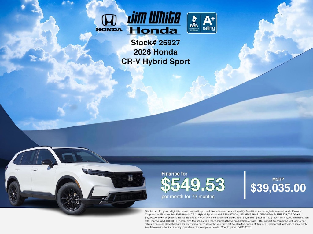 If you are ready to finance a new Honda near Maumee, Toledo, Perrysburg, and Waterville, Jim White Honda is thrilled to offer you competitive finance deals on this 2026 Honda CR-V Hybrid Sport. Here is how the monthly payment of $549.53 is calculated for well-qualified buyers shopping Jim White Honda with Tier 1 credit (use our car loan payment calculator or monthly car payment calculator for estimates):