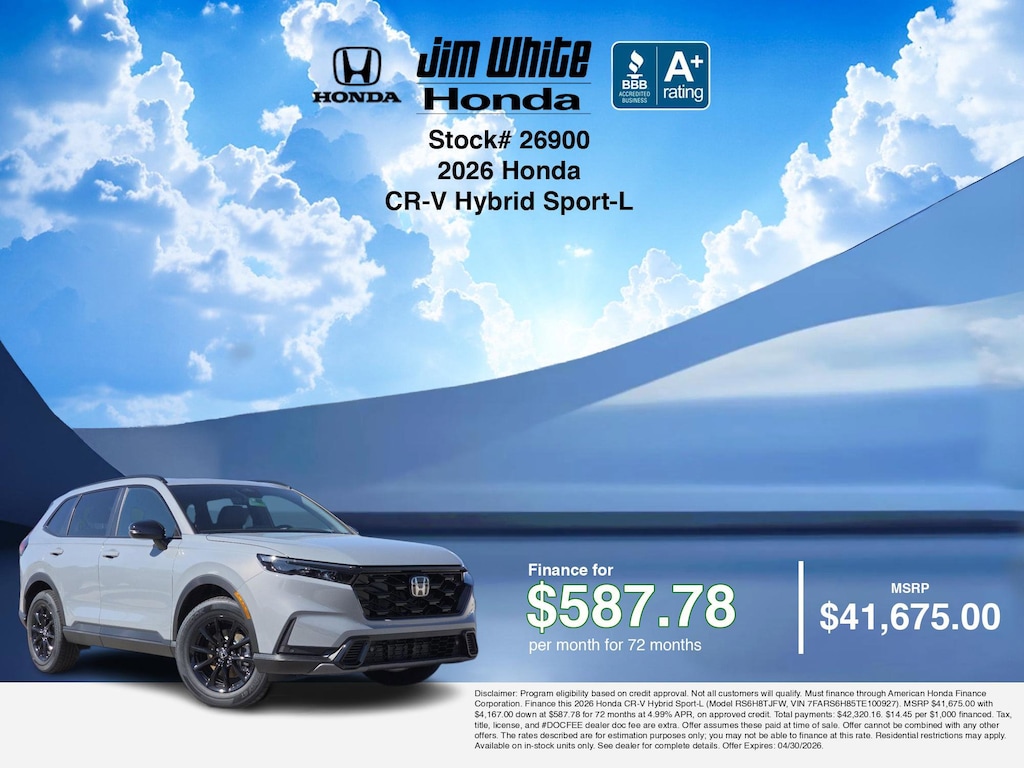 These offers leverage the benefits of Honda Financial Services, along with current Honda incentives, Honda CR-V Hybrid Sport-L specials, and tax incentives available on electric vehicles. Additionally, we offer 2 other CR-V Hybrid Sport-L options for the best selection in Maumee. Call or drive in for competitive Honda lease offers you can drive home today, like this stunning 2026 Honda CR-V Hybrid with lease options near Maumee! This CR-V Hybrid is also available for sale near Toledo, Perrysburg, and Waterville. These Honda lease specials end 4/30/2026 Disclaimer: Disclaimer: Program eligibility based on credit approval. Not all customers will qualify. Must finance through American Honda Finance Corporation. Lease this 2026 Honda CR-V Hybrid Sport-L (Model RS6H8TJFW; VIN 7FARS6H85TE100927). MSRP $41,675.00. With $4,167.00 down at $423.62 for 36 months, on approved credit. $0.00 security deposit required. $4,590.62 due at signing - includes 1st mo. payment of $423.62. Total payments: $15,250.32. Tax, title, license, and #DOCFEE dealer doc fee are extra. Offer assumes these paid at time of sale. Lessee responsible for maintenance, repairs, excessive wear and tear, and $0.20/mile over 10000 miles/year. Early lease termination fee may apply. Option to purchase vehicle at lease end is $27,505.50. Offer cannot be combined with any other offers. Residential restrictions may apply. Available on in-stock units only. See dealer for complete details. Offer Expires: 04/30/2026.