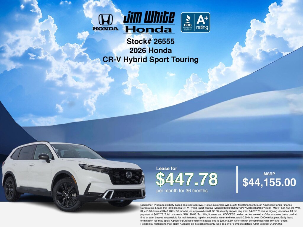These offers leverage the benefits of Honda Financial Services, along with current Honda incentives, Honda CR-V Hybrid Sport Touring specials, and tax incentives available on electric vehicles. Additionally, we offer 6 other CR-V Hybrid Sport Touring options for the best selection in Maumee. Call or drive in for competitive Honda lease offers you can drive home today, like this stunning 2026 Honda CR-V Hybrid with lease options near Maumee! This CR-V Hybrid is also available for sale near Toledo, Perrysburg, and Waterville. These Honda lease specials end 1/5/2026 Disclaimer: Disclaimer: Program eligibility based on credit approval. Not all customers will qualify. Must finance through American Honda Finance Corporation. Lease this 2026 Honda CR-V Hybrid Sport Touring (Model RS6H9TKXW; VIN 7FARS6H92TE070620). MSRP $44,155.00. With $4,415.00 down at $447.78 for 36 months, on approved credit. $0.00 security deposit required. $4,862.78 due at signing - includes 1st mo. payment of $447.78. Total payments: $16,120.08. Tax, title, license, and #DOCFEE dealer doc fee are extra. Offer assumes these paid at time of sale. Lessee responsible for maintenance, repairs, excessive wear and tear, and $0.20/mile over 10000 miles/year. Early lease termination fee may apply. Option to purchase vehicle at lease end is $29,142.30. Offer cannot be combined with any other offers. Residential restrictions may apply. Available on in-stock units only. See dealer for complete details. Offer Expires: 01/05/2026.