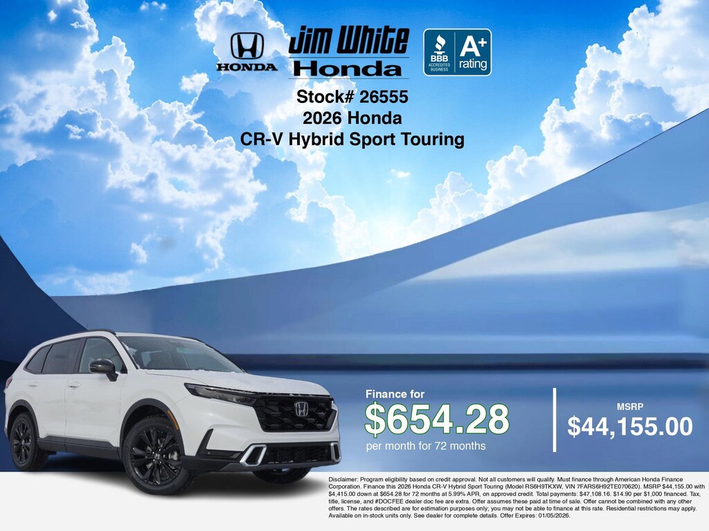 If you are ready to finance a new Honda near Maumee, Toledo, Perrysburg, and Waterville, Jim White Honda is thrilled to offer you competitive finance deals on this 2026 Honda CR-V Hybrid Sport Touring. Here is how the monthly payment of $654.28 is calculated for well-qualified buyers shopping Jim White Honda with Tier 1 credit (use our car loan payment calculator or monthly car payment calculator for estimates):