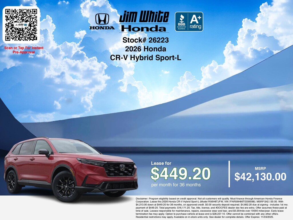 These offers leverage the benefits of Honda Financial Services, along with current Honda incentives, Honda CR-V Hybrid Sport-L specials, and tax incentives available on electric vehicles. Additionally, we offer 10 other CR-V Hybrid Sport-L options for the best selection in Maumee. Call or drive in for competitive Honda lease offers you can drive home today, like this stunning 2026 Honda CR-V Hybrid with lease options near Maumee! This CR-V Hybrid is also available for sale near Toledo, Perrysburg, and Waterville. These Honda lease specials end 11/3/2025 Disclaimer: Disclaimer: Program eligibility based on credit approval. Not all customers will qualify. Must finance through American Honda Finance Corporation. Lease this 2026 Honda CR-V Hybrid Sport-L (Model RS6H8TJFW; VIN 7FARS6H86TE036588). MSRP $42,130.00. With $4,213.00 down at $449.20 for 36 months, on approved credit. $0.00 security deposit required. $4,662.20 due at signing - includes 1st mo. payment of $449.20. Total payments: $16,171.20. Tax, title, license, and #DOCFEE dealer doc fee are extra. Offer assumes these paid at time of sale. Lessee responsible for maintenance, repairs, excessive wear and tear, and $0.20/mile over 10000 miles/year. Early lease termination fee may apply. Option to purchase vehicle at lease end is $28,227.10. Offer cannot be combined with any other offers. Residential restrictions may apply. Available on in-stock units only. See dealer for complete details. Offer Expires: 11/03/2025.