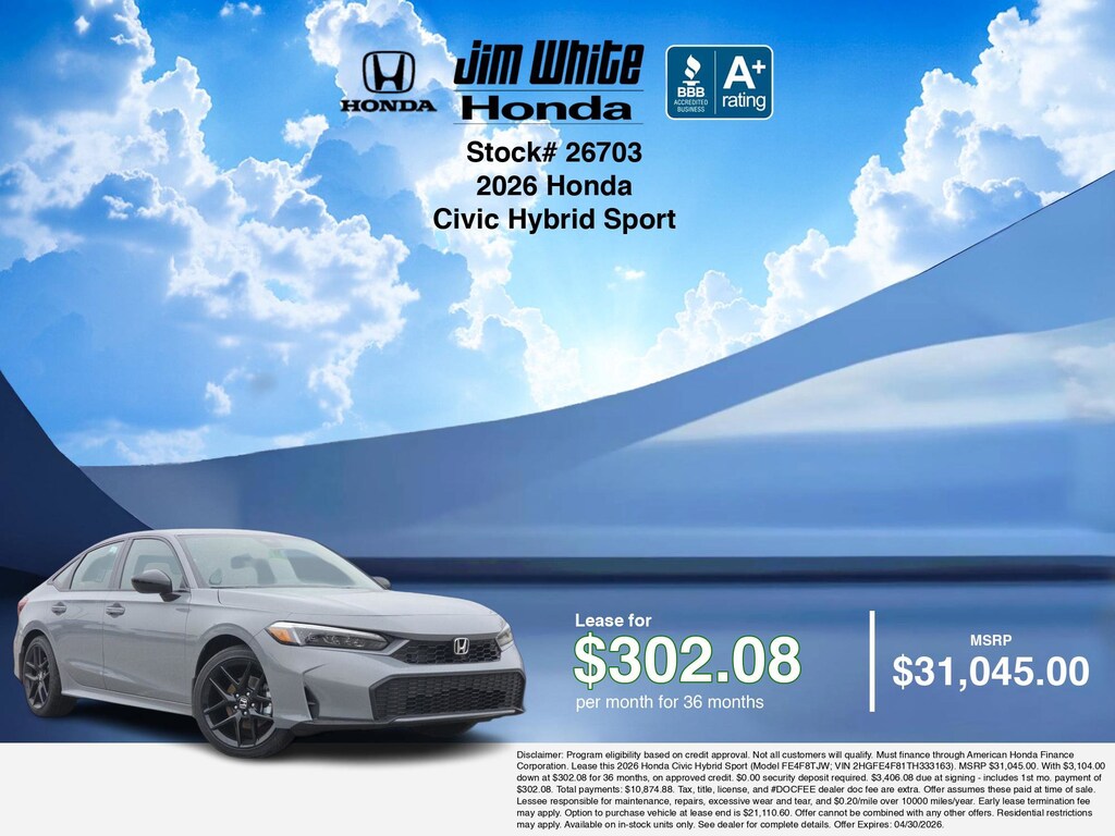 These offers leverage the benefits of Honda Financial Services, along with current Honda incentives, Honda Civic Hybrid Sport specials, and tax incentives available on electric vehicles. Additionally, we offer 6 other Civic Hybrid Sport options for the best selection in Maumee. Call or drive in for competitive Honda lease offers you can drive home today, like this stunning 2026 Honda Civic Hybrid with lease options near Maumee! This Civic Hybrid is also available for sale near Toledo, Perrysburg, and Waterville. These Honda lease specials end 4/30/2026 Disclaimer: Disclaimer: Program eligibility based on credit approval. Not all customers will qualify. Must finance through American Honda Finance Corporation. Lease this 2026 Honda Civic Hybrid Sport (Model FE4F8TJW; VIN 2HGFE4F81TH333163). MSRP $31,045.00. With $3,104.00 down at $302.08 for 36 months, on approved credit. $0.00 security deposit required. $3,406.08 due at signing - includes 1st mo. payment of $302.08. Total payments: $10,874.88. Tax, title, license, and #DOCFEE dealer doc fee are extra. Offer assumes these paid at time of sale. Lessee responsible for maintenance, repairs, excessive wear and tear, and $0.20/mile over 10000 miles/year. Early lease termination fee may apply. Option to purchase vehicle at lease end is $21,110.60. Offer cannot be combined with any other offers. Residential restrictions may apply. Available on in-stock units only. See dealer for complete details. Offer Expires: 04/30/2026.