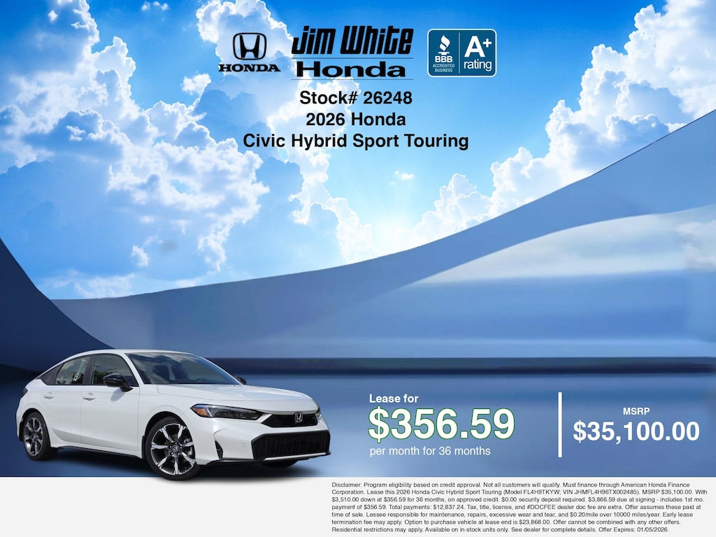 If you are looking to lease a car or explore car lease offers for a new Honda near Maumee, Toledo, Perrysburg, and Waterville, Jim White Honda is thrilled to offer you competitive car lease deals on this 2026 Honda Civic Hybrid Sport Touring. Here is how the monthly payment of $356.59 is calculated for well-qualified buyers shopping Jim White Honda with Tier 1 credit (use our car lease calculator or monthly car payment calculator for estimates):