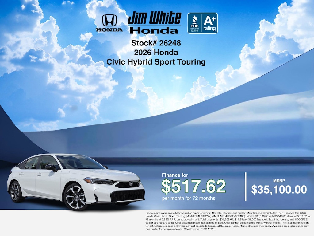 Our car payment calculator and estimator tools can help you understand these finance offers that leverage the benefits of Honda Financial Services, along with Honda vehicle incentives right now and current Honda Civic Hybrid Sport Touring specials. Additionally, we offer 5 other Civic Hybrid Sport Touring options for the best selection in Maumee. Call or drive in for Honda finance deals you can drive home today! Disclaimer: Disclaimer: Program eligibility based on credit approval. Not all customers will qualify. Must finance through Ally Loan. Finance this 2026 Honda Civic Hybrid Sport Touring (Model FL4H9TKYW, VIN JHMFL4H96TX002485). MSRP $35,100.00 with $3,510.00 down at $517.62 for 72 months at 5.88% APR, on approved credit. Total payments: $37,268.64. $14.85 per $1,000 financed. Tax, title, license, and #DOCFEE dealer doc fee are extra. Offer assumes these paid at time of sale. Offer cannot be combined with any other offers. The rates described are for estimation purposes only; you may not be able to finance at this rate. Residential restrictions may apply. Available on in-stock units only. See dealer for complete details. Offer Expires: 01/31/2026.