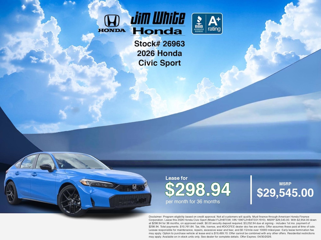 These offers leverage the benefits of Honda Financial Services, along with current Honda incentives, Honda Civic Sport specials, and tax incentives available on electric vehicles. Additionally, we offer 6 other Civic Sport options for the best selection in Maumee. Call or drive in for competitive Honda lease offers you can drive home today, like this stunning 2026 Honda Civic with lease options near Maumee! This Civic is also available for sale near Toledo, Perrysburg, and Waterville. These Honda lease specials end 4/30/2026 Disclaimer: Disclaimer: Program eligibility based on credit approval. Not all customers will qualify. Must finance through American Honda Finance Corporation. Lease this 2026 Honda Civic Sport (Model FL2H8TEW; VIN 19XFL2H84TE017970). MSRP $29,545.00. With $2,954.00 down at $298.94 for 36 months, on approved credit. $0.00 security deposit required. $3,252.94 due at signing - includes 1st mo. payment of $298.94. Total payments: $10,761.84. Tax, title, license, and #DOCFEE dealer doc fee are extra. Offer assumes these paid at time of sale. Lessee responsible for maintenance, repairs, excessive wear and tear, and $0.15/mile over 10000 miles/year. Early lease termination fee may apply. Option to purchase vehicle at lease end is $19,499.70. Offer cannot be combined with any other offers. Residential restrictions may apply. Available on in-stock units only. See dealer for complete details. Offer Expires: 04/30/2026.