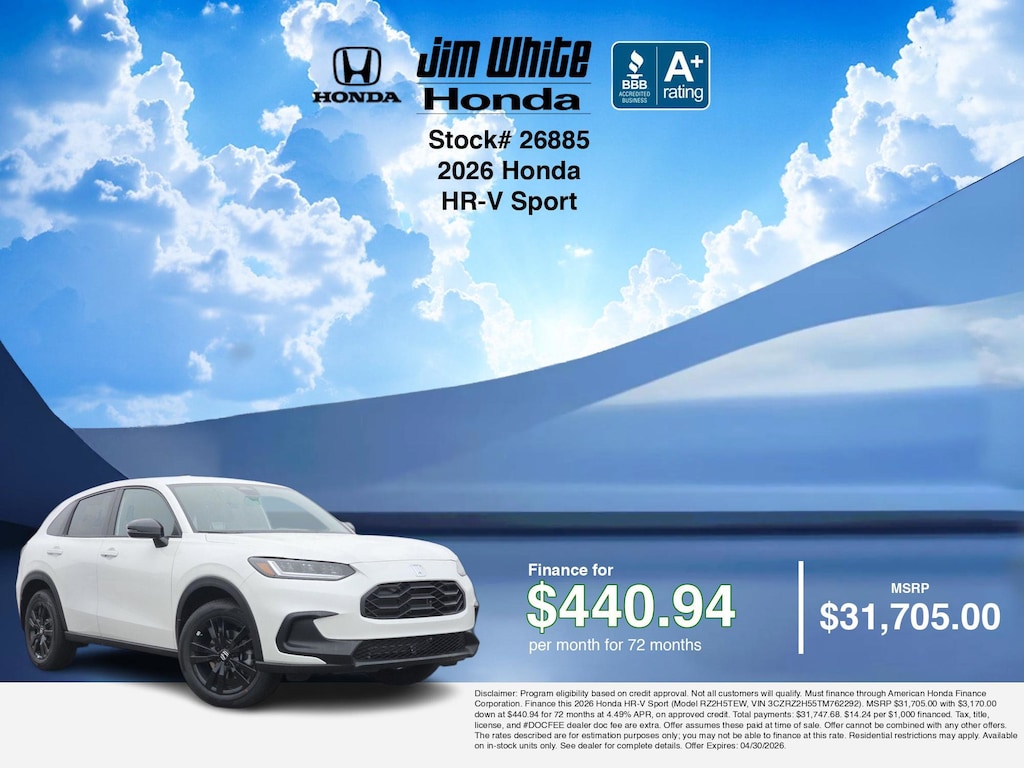 Our car payment calculator and estimator tools can help you understand these finance offers that leverage the benefits of Honda Financial Services, along with Honda vehicle incentives right now and current Honda HR-V Sport specials. Additionally, we offer 13 other HR-V Sport options for the best selection in Maumee. Call or drive in for Honda finance deals you can drive home today! Disclaimer: Disclaimer: Program eligibility based on credit approval. Not all customers will qualify. Must finance through American Honda Finance Corporation. Finance this 2026 Honda HR-V Sport (Model RZ2H5TEW, VIN 3CZRZ2H55TM762292). MSRP $31,705.00 with $3,170.00 down at $440.94 for 72 months at 4.49% APR, on approved credit. Total payments: $31,747.68. $14.24 per $1,000 financed. Tax, title, license, and #DOCFEE dealer doc fee are extra. Offer assumes these paid at time of sale. Offer cannot be combined with any other offers. The rates described are for estimation purposes only; you may not be able to finance at this rate. Residential restrictions may apply. Available on in-stock units only. See dealer for complete details. Offer Expires: 04/30/2026.