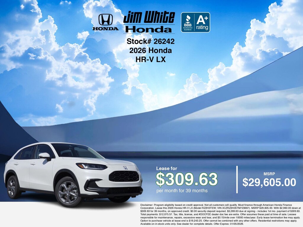 These offers leverage the benefits of Honda Financial Services, along with current Honda incentives, Honda HR-V LX specials, and tax incentives available on electric vehicles. Additionally, we offer 10 other HR-V LX options for the best selection in Maumee. Call or drive in for competitive Honda lease offers you can drive home today, like this stunning 2026 Honda HR-V with lease options near Maumee! This HR-V is also available for sale near Toledo, Perrysburg, and Waterville. These Honda lease specials end 1/5/2026 Disclaimer: Disclaimer: Program eligibility based on credit approval. Not all customers will qualify. Must finance through American Honda Finance Corporation. Lease this 2026 Honda HR-V LX (Model RZ2H3TEW; VIN 3CZRZ2H35TM723667). MSRP $29,605.00. With $2,960.00 down at $309.63 for 39 months, on approved credit. $0.00 security deposit required. $3,269.63 due at signing - includes 1st mo. payment of $309.63. Total payments: $12,075.57. Tax, title, license, and #DOCFEE dealer doc fee are extra. Offer assumes these paid at time of sale. Lessee responsible for maintenance, repairs, excessive wear and tear, and $0.15/mile over 10000 miles/year. Early lease termination fee may apply. Option to purchase vehicle at lease end is $19,243.25. Offer cannot be combined with any other offers. Residential restrictions may apply. Available on in-stock units only. See dealer for complete details. Offer Expires: 01/05/2026.