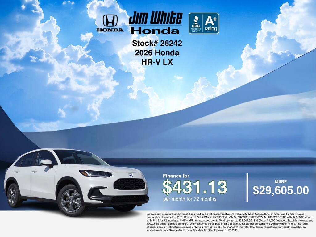 Our car payment calculator and estimator tools can help you understand these finance offers that leverage the benefits of Honda Financial Services, along with Honda vehicle incentives right now and current Honda HR-V LX specials. Additionally, we offer 10 other HR-V LX options for the best selection in Maumee. Call or drive in for Honda finance deals you can drive home today! Disclaimer: Disclaimer: Program eligibility based on credit approval. Not all customers will qualify. Must finance through American Honda Finance Corporation. Finance this 2026 Honda HR-V LX (Model RZ2H3TEW, VIN 3CZRZ2H35TM723667). MSRP $29,605.00 with $2,960.00 down at $431.13 for 72 months at 5.49% APR, on approved credit. Total payments: $31,041.36. $14.69 per $1,000 financed. Tax, title, license, and #DOCFEE dealer doc fee are extra. Offer assumes these paid at time of sale. Offer cannot be combined with any other offers. The rates described are for estimation purposes only; you may not be able to finance at this rate. Residential restrictions may apply. Available on in-stock units only. See dealer for complete details. Offer Expires: 01/05/2026.