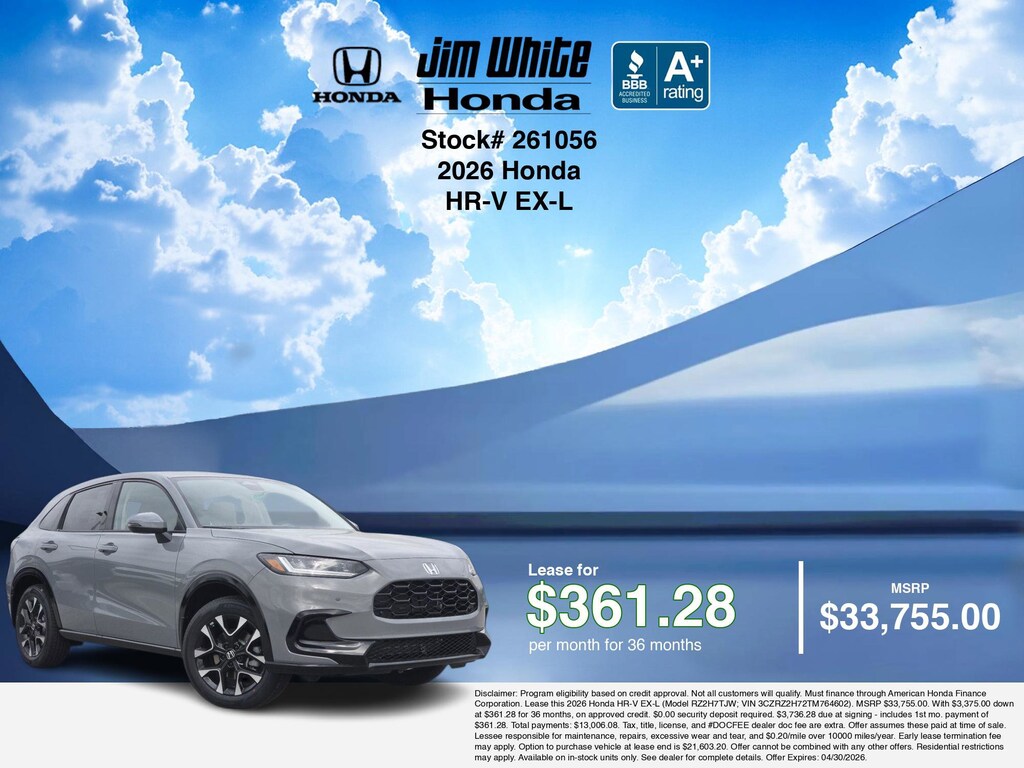 These offers leverage the benefits of Honda Financial Services, along with current Honda incentives, Honda HR-V EX-L specials, and tax incentives available on electric vehicles. Additionally, we offer 15 other HR-V EX-L options for the best selection in Maumee. Call or drive in for competitive Honda lease offers you can drive home today, like this stunning 2026 Honda HR-V with lease options near Maumee! This HR-V is also available for sale near Toledo, Perrysburg, and Waterville. These Honda lease specials end 4/30/2026 Disclaimer: Disclaimer: Program eligibility based on credit approval. Not all customers will qualify. Must finance through American Honda Finance Corporation. Lease this 2026 Honda HR-V EX-L (Model RZ2H7TJW; VIN 3CZRZ2H72TM764602). MSRP $33,755.00. With $3,375.00 down at $361.28 for 36 months, on approved credit. $0.00 security deposit required. $3,736.28 due at signing - includes 1st mo. payment of $361.28. Total payments: $13,006.08. Tax, title, license, and #DOCFEE dealer doc fee are extra. Offer assumes these paid at time of sale. Lessee responsible for maintenance, repairs, excessive wear and tear, and $0.20/mile over 10000 miles/year. Early lease termination fee may apply. Option to purchase vehicle at lease end is $21,603.20. Offer cannot be combined with any other offers. Residential restrictions may apply. Available on in-stock units only. See dealer for complete details. Offer Expires: 04/30/2026.