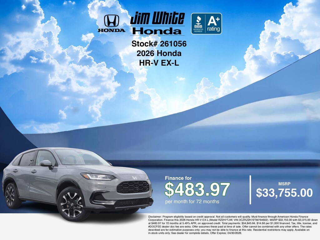 Our car payment calculator and estimator tools can help you understand these finance offers that leverage the benefits of Honda Financial Services, along with Honda vehicle incentives right now and current Honda HR-V EX-L specials. Additionally, we offer 15 other HR-V EX-L options for the best selection in Maumee. Call or drive in for Honda finance deals you can drive home today! Disclaimer: Disclaimer: Program eligibility based on credit approval. Not all customers will qualify. Must finance through American Honda Finance Corporation. Finance this 2026 Honda HR-V EX-L (Model RZ2H7TJW, VIN 3CZRZ2H72TM764602). MSRP $33,755.00 with $3,375.00 down at $483.97 for 72 months at 5.49% APR, on approved credit. Total payments: $34,845.84. $14.66 per $1,000 financed. Tax, title, license, and #DOCFEE dealer doc fee are extra. Offer assumes these paid at time of sale. Offer cannot be combined with any other offers. The rates described are for estimation purposes only; you may not be able to finance at this rate. Residential restrictions may apply. Available on in-stock units only. See dealer for complete details. Offer Expires: 04/30/2026.
