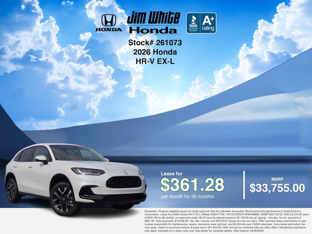 These offers leverage the benefits of Honda Financial Services, along with current Honda incentives, Honda HR-V EX-L specials, and tax incentives available on electric vehicles. Additionally, we offer 14 other HR-V EX-L options for the best selection in Maumee. Call or drive in for competitive Honda lease offers you can drive home today, like this stunning 2026 Honda HR-V with lease options near Maumee! This HR-V is also available for sale near Toledo, Perrysburg, and Waterville. These Honda lease specials end 4/30/2026 Disclaimer: Disclaimer: Program eligibility based on credit approval. Not all customers will qualify. Must finance through American Honda Finance Corporation. Lease this 2026 Honda HR-V EX-L (Model RZ2H7TJW; VIN 3CZRZ2H74TM769686). MSRP $33,755.00. With $3,375.00 down at $361.28 for 36 months, on approved credit. $0.00 security deposit required. $3,736.28 due at signing - includes 1st mo. payment of $361.28. Total payments: $13,006.08. Tax, title, license, and #DOCFEE dealer doc fee are extra. Offer assumes these paid at time of sale. Lessee responsible for maintenance, repairs, excessive wear and tear, and $0.20/mile over 10000 miles/year. Early lease termination fee may apply. Option to purchase vehicle at lease end is $21,603.20. Offer cannot be combined with any other offers. Residential restrictions may apply. Available on in-stock units only. See dealer for complete details. Offer Expires: 04/30/2026.