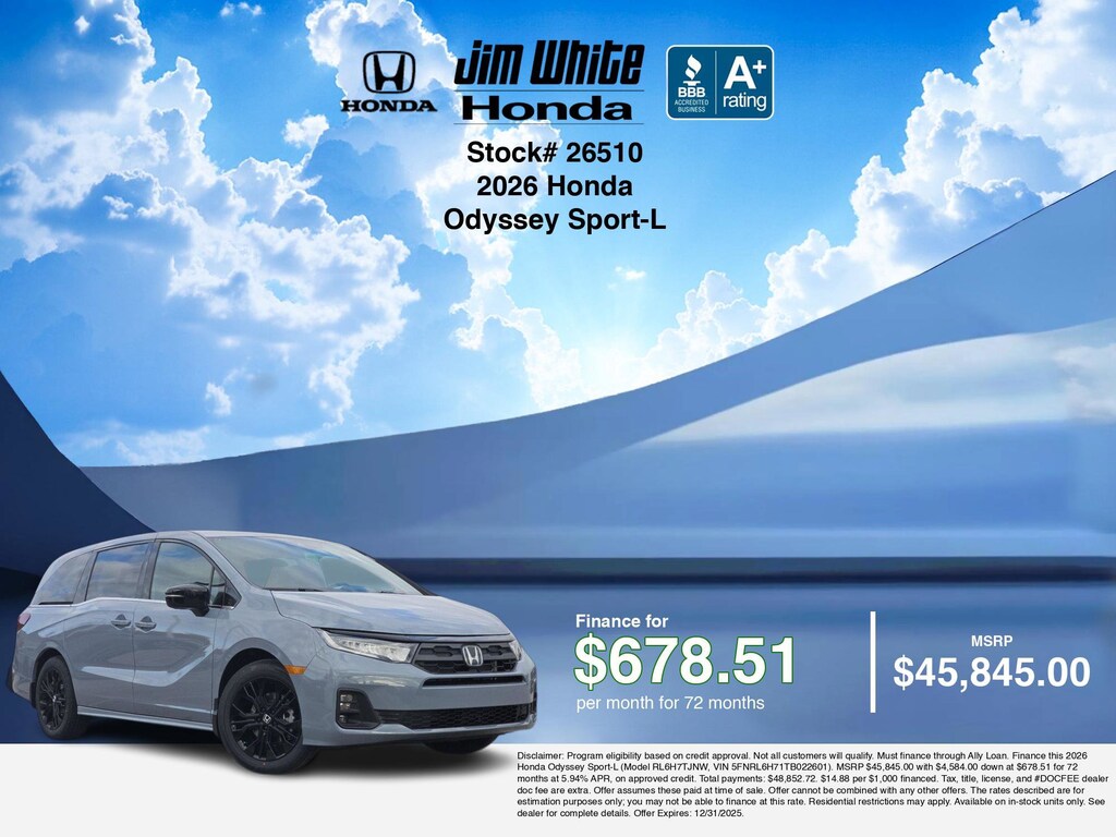 Our car payment calculator and estimator tools can help you understand these finance offers that leverage the benefits of Honda Financial Services, along with Honda vehicle incentives right now and current Honda Odyssey Sport-L specials. Additionally, we offer 3 other Odyssey Sport-L options for the best selection in Maumee. Call or drive in for Honda finance deals you can drive home today! Disclaimer: Disclaimer: Program eligibility based on credit approval. Not all customers will qualify. Must finance through Ally Loan. Finance this 2026 Honda Odyssey Sport-L (Model RL6H7TJNW, VIN 5FNRL6H71TB022601). MSRP $45,845.00 with $4,584.00 down at $678.51 for 72 months at 5.94% APR, on approved credit. Total payments: $48,852.72. $14.88 per $1,000 financed. Tax, title, license, and #DOCFEE dealer doc fee are extra. Offer assumes these paid at time of sale. Offer cannot be combined with any other offers. The rates described are for estimation purposes only; you may not be able to finance at this rate. Residential restrictions may apply. Available on in-stock units only. See dealer for complete details. Offer Expires: 12/31/2025.