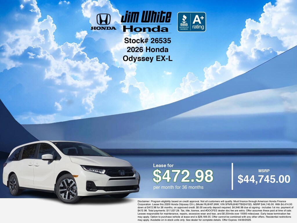 These offers leverage the benefits of Honda Financial Services, along with current Honda incentives, Honda Odyssey EX-L specials, and tax incentives available on electric vehicles. Additionally, we offer 7 other Odyssey EX-L options for the best selection in Maumee. Call or drive in for competitive Honda lease offers you can drive home today, like this stunning 2026 Honda Odyssey with lease options near Maumee! This Odyssey is also available for sale near Toledo, Perrysburg, and Waterville. These Honda lease specials end 4/30/2026 Disclaimer: Disclaimer: Program eligibility based on credit approval. Not all customers will qualify. Must finance through American Honda Finance Corporation. Lease this 2026 Honda Odyssey EX-L (Model RL6H6TJNW; VIN 5FNRL6H67TB024702). MSRP $44,745.00. With $4,474.00 down at $472.98 for 36 months, on approved credit. $0.00 security deposit required. $4,946.98 due at signing - includes 1st mo. payment of $472.98. Total payments: $17,027.28. Tax, title, license, and #DOCFEE dealer doc fee are extra. Offer assumes these paid at time of sale. Lessee responsible for maintenance, repairs, excessive wear and tear, and $0.20/mile over 10000 miles/year. Early lease termination fee may apply. Option to purchase vehicle at lease end is $28,189.35. Offer cannot be combined with any other offers. Residential restrictions may apply. Available on in-stock units only. See dealer for complete details. Offer Expires: 04/30/2026.