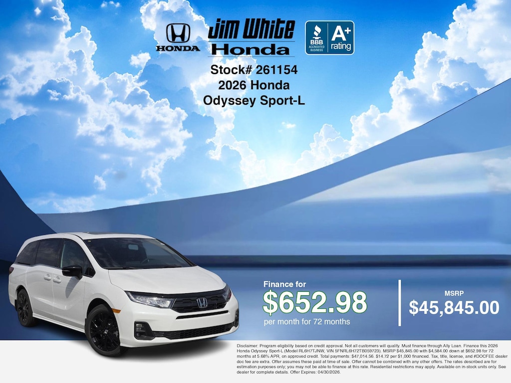 Our car payment calculator and estimator tools can help you understand these finance offers that leverage the benefits of Honda Financial Services, along with Honda vehicle incentives right now and current Honda Odyssey Sport-L specials. Additionally, we offer 5 other Odyssey Sport-L options for the best selection in Maumee. Call or drive in for Honda finance deals you can drive home today! Disclaimer: Disclaimer: Program eligibility based on credit approval. Not all customers will qualify. Must finance through Ally Loan. Finance this 2026 Honda Odyssey Sport-L (Model RL6H7TJNW, VIN 5FNRL6H72TB059723). MSRP $45,845.00 with $4,584.00 down at $652.98 for 72 months at 5.68% APR, on approved credit. Total payments: $47,014.56. $14.72 per $1,000 financed. Tax, title, license, and #DOCFEE dealer doc fee are extra. Offer assumes these paid at time of sale. Offer cannot be combined with any other offers. The rates described are for estimation purposes only; you may not be able to finance at this rate. Residential restrictions may apply. Available on in-stock units only. See dealer for complete details. Offer Expires: 04/30/2026.