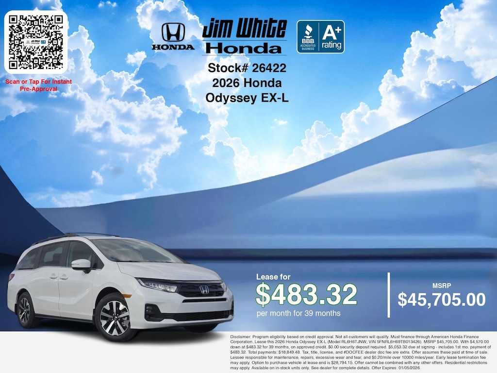 These offers leverage the benefits of Honda Financial Services, along with current Honda incentives, Honda Odyssey EX-L specials, and tax incentives available on electric vehicles. Additionally, we offer 13 other Odyssey EX-L options for the best selection in Maumee. Call or drive in for competitive Honda lease offers you can drive home today, like this stunning 2026 Honda Odyssey with lease options near Maumee! This Odyssey is also available for sale near Toledo, Perrysburg, and Waterville. These Honda lease specials end 1/5/2026 Disclaimer: Disclaimer: Program eligibility based on credit approval. Not all customers will qualify. Must finance through American Honda Finance Corporation. Lease this 2026 Honda Odyssey EX-L (Model RL6H6TJNW; VIN 5FNRL6H69TB013426). MSRP $45,705.00. With $4,570.00 down at $483.32 for 39 months, on approved credit. $0.00 security deposit required. $5,053.32 due at signing - includes 1st mo. payment of $483.32. Total payments: $18,849.48. Tax, title, license, and #DOCFEE dealer doc fee are extra. Offer assumes these paid at time of sale. Lessee responsible for maintenance, repairs, excessive wear and tear, and $0.20/mile over 10000 miles/year. Early lease termination fee may apply. Option to purchase vehicle at lease end is $28,794.15. Offer cannot be combined with any other offers. Residential restrictions may apply. Available on in-stock units only. See dealer for complete details. Offer Expires: 01/05/2026.