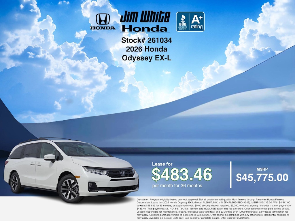 These offers leverage the benefits of Honda Financial Services, along with current Honda incentives, Honda Odyssey EX-L specials, and tax incentives available on electric vehicles. Additionally, we offer 5 other Odyssey EX-L options for the best selection in Maumee. Call or drive in for competitive Honda lease offers you can drive home today, like this stunning 2026 Honda Odyssey with lease options near Maumee! This Odyssey is also available for sale near Toledo, Perrysburg, and Waterville. These Honda lease specials end 4/30/2026 Disclaimer: Disclaimer: Program eligibility based on credit approval. Not all customers will qualify. Must finance through American Honda Finance Corporation. Lease this 2026 Honda Odyssey EX-L (Model RL6H6TJNW; VIN 5FNRL6H64TB047242). MSRP $45,775.00. With $4,577.00 down at $483.46 for 36 months, on approved credit. $0.00 security deposit required. $5,060.46 due at signing - includes 1st mo. payment of $483.46. Total payments: $17,404.56. Tax, title, license, and #DOCFEE dealer doc fee are extra. Offer assumes these paid at time of sale. Lessee responsible for maintenance, repairs, excessive wear and tear, and $0.20/mile over 10000 miles/year. Early lease termination fee may apply. Option to purchase vehicle at lease end is $28,838.25. Offer cannot be combined with any other offers. Residential restrictions may apply. Available on in-stock units only. See dealer for complete details. Offer Expires: 04/30/2026.