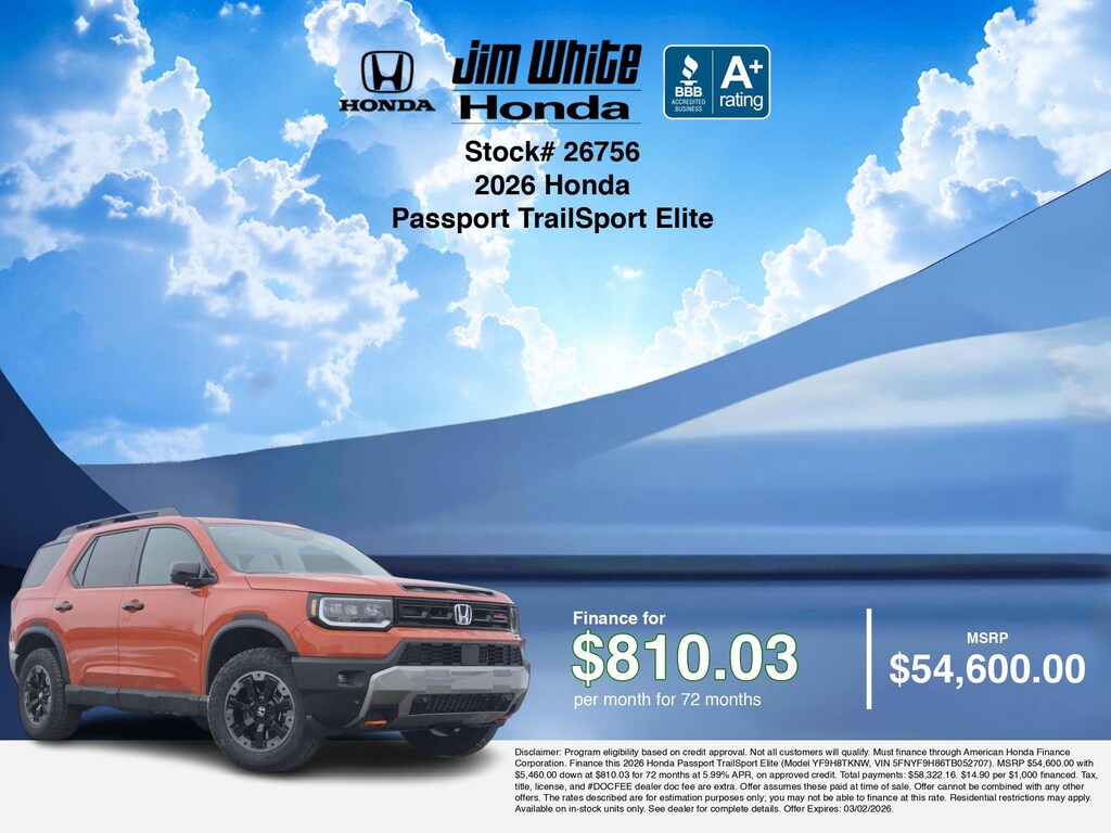Our car payment calculator and estimator tools can help you understand these finance offers that leverage the benefits of Honda Financial Services, along with Honda vehicle incentives right now and current Honda Passport TrailSport Elite specials. Additionally, we offer 9 other Passport TrailSport Elite options for the best selection in Maumee. Call or drive in for Honda finance deals you can drive home today! Disclaimer: Disclaimer: Program eligibility based on credit approval. Not all customers will qualify. Must finance through American Honda Finance Corporation. Finance this 2026 Honda Passport TrailSport Elite (Model YF9H8TKNW, VIN 5FNYF9H86TB052707). MSRP $54,600.00 with $5,460.00 down at $810.03 for 72 months at 5.99% APR, on approved credit. Total payments: $58,322.16. $14.90 per $1,000 financed. Tax, title, license, and #DOCFEE dealer doc fee are extra. Offer assumes these paid at time of sale. Offer cannot be combined with any other offers. The rates described are for estimation purposes only; you may not be able to finance at this rate. Residential restrictions may apply. Available on in-stock units only. See dealer for complete details. Offer Expires: 03/02/2026.