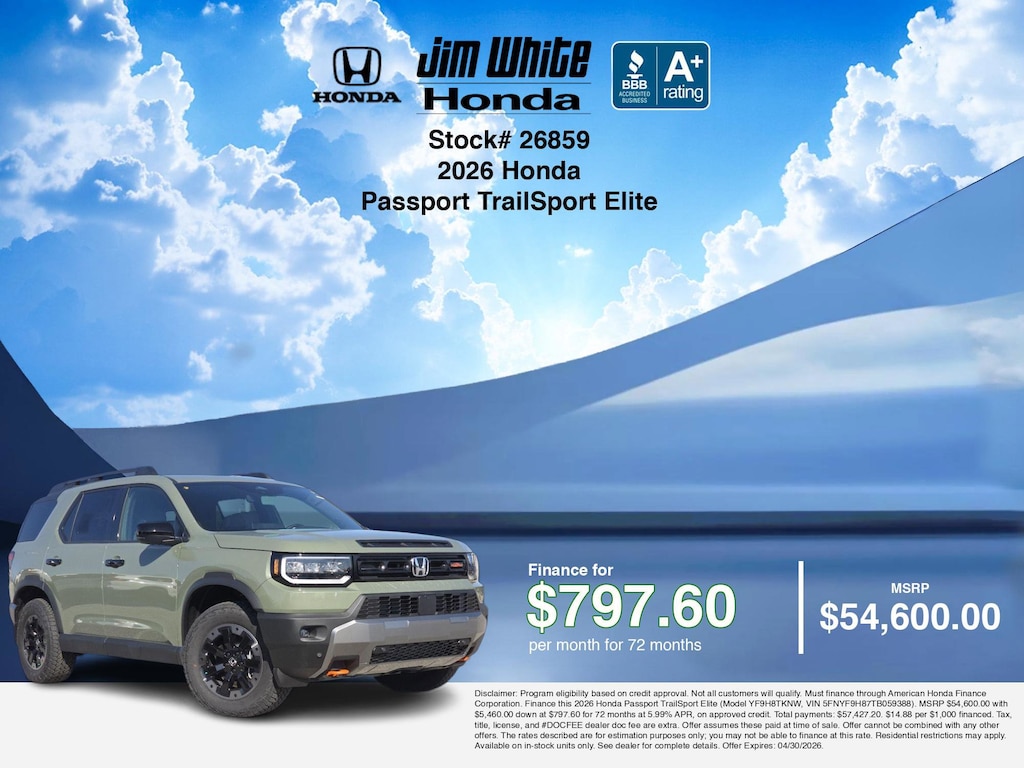 Our car payment calculator and estimator tools can help you understand these finance offers that leverage the benefits of Honda Financial Services, along with Honda vehicle incentives right now and current Honda Passport TrailSport Elite specials. Additionally, we offer 9 other Passport TrailSport Elite options for the best selection in Maumee. Call or drive in for Honda finance deals you can drive home today! Disclaimer: Disclaimer: Program eligibility based on credit approval. Not all customers will qualify. Must finance through American Honda Finance Corporation. Finance this 2026 Honda Passport TrailSport Elite (Model YF9H8TKNW, VIN 5FNYF9H87TB059388). MSRP $54,600.00 with $5,460.00 down at $797.60 for 72 months at 5.99% APR, on approved credit. Total payments: $57,427.20. $14.88 per $1,000 financed. Tax, title, license, and #DOCFEE dealer doc fee are extra. Offer assumes these paid at time of sale. Offer cannot be combined with any other offers. The rates described are for estimation purposes only; you may not be able to finance at this rate. Residential restrictions may apply. Available on in-stock units only. See dealer for complete details. Offer Expires: 04/30/2026.
