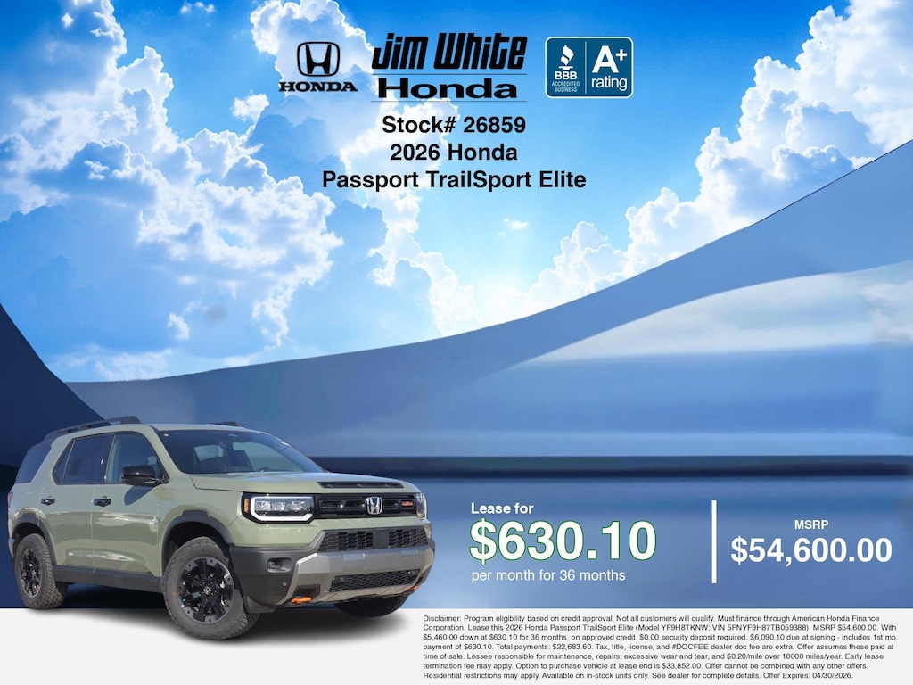 These offers leverage the benefits of Honda Financial Services, along with current Honda incentives, Honda Passport TrailSport Elite specials, and tax incentives available on electric vehicles. Additionally, we offer 9 other Passport TrailSport Elite options for the best selection in Maumee. Call or drive in for competitive Honda lease offers you can drive home today, like this stunning 2026 Honda Passport with lease options near Maumee! This Passport is also available for sale near Toledo, Perrysburg, and Waterville. These Honda lease specials end 4/30/2026 Disclaimer: Disclaimer: Program eligibility based on credit approval. Not all customers will qualify. Must finance through American Honda Finance Corporation. Lease this 2026 Honda Passport TrailSport Elite (Model YF9H8TKNW; VIN 5FNYF9H87TB059388). MSRP $54,600.00. With $5,460.00 down at $630.10 for 36 months, on approved credit. $0.00 security deposit required. $6,090.10 due at signing - includes 1st mo. payment of $630.10. Total payments: $22,683.60. Tax, title, license, and #DOCFEE dealer doc fee are extra. Offer assumes these paid at time of sale. Lessee responsible for maintenance, repairs, excessive wear and tear, and $0.20/mile over 10000 miles/year. Early lease termination fee may apply. Option to purchase vehicle at lease end is $33,852.00. Offer cannot be combined with any other offers. Residential restrictions may apply. Available on in-stock units only. See dealer for complete details. Offer Expires: 04/30/2026.