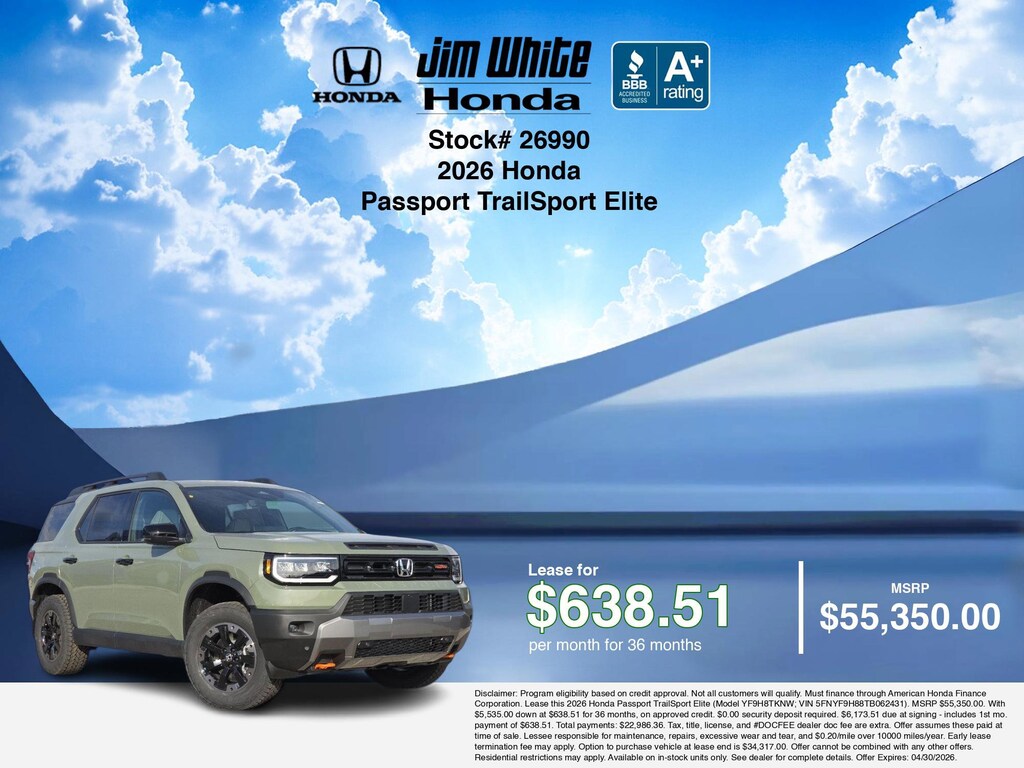 These offers leverage the benefits of Honda Financial Services, along with current Honda incentives, Honda Passport TrailSport Elite specials, and tax incentives available on electric vehicles. Additionally, we offer 11 other Passport TrailSport Elite options for the best selection in Maumee. Call or drive in for competitive Honda lease offers you can drive home today, like this stunning 2026 Honda Passport with lease options near Maumee! This Passport is also available for sale near Toledo, Perrysburg, and Waterville. These Honda lease specials end 4/30/2026 Disclaimer: Disclaimer: Program eligibility based on credit approval. Not all customers will qualify. Must finance through American Honda Finance Corporation. Lease this 2026 Honda Passport TrailSport Elite (Model YF9H8TKNW; VIN 5FNYF9H88TB062431). MSRP $55,350.00. With $5,535.00 down at $638.51 for 36 months, on approved credit. $0.00 security deposit required. $6,173.51 due at signing - includes 1st mo. payment of $638.51. Total payments: $22,986.36. Tax, title, license, and #DOCFEE dealer doc fee are extra. Offer assumes these paid at time of sale. Lessee responsible for maintenance, repairs, excessive wear and tear, and $0.20/mile over 10000 miles/year. Early lease termination fee may apply. Option to purchase vehicle at lease end is $34,317.00. Offer cannot be combined with any other offers. Residential restrictions may apply. Available on in-stock units only. See dealer for complete details. Offer Expires: 04/30/2026.