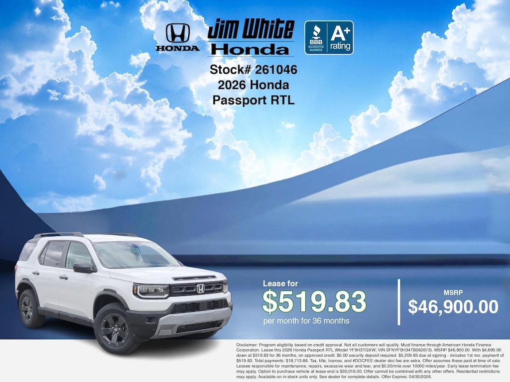 These offers leverage the benefits of Honda Financial Services, along with current Honda incentives, Honda Passport RTL specials, and tax incentives available on electric vehicles. Additionally, we offer 5 other Passport RTL options for the best selection in Maumee. Call or drive in for competitive Honda lease offers you can drive home today, like this stunning 2026 Honda Passport with lease options near Maumee! This Passport is also available for sale near Toledo, Perrysburg, and Waterville. These Honda lease specials end 4/30/2026 Disclaimer: Disclaimer: Program eligibility based on credit approval. Not all customers will qualify. Must finance through American Honda Finance Corporation. Lease this 2026 Honda Passport RTL (Model YF9H3TGXW; VIN 5FNYF9H34TB062673). MSRP $46,900.00. With $4,690.00 down at $519.83 for 36 months, on approved credit. $0.00 security deposit required. $5,209.83 due at signing - includes 1st mo. payment of $519.83. Total payments: $18,713.88. Tax, title, license, and #DOCFEE dealer doc fee are extra. Offer assumes these paid at time of sale. Lessee responsible for maintenance, repairs, excessive wear and tear, and $0.20/mile over 10000 miles/year. Early lease termination fee may apply. Option to purchase vehicle at lease end is $30,016.00. Offer cannot be combined with any other offers. Residential restrictions may apply. Available on in-stock units only. See dealer for complete details. Offer Expires: 04/30/2026.