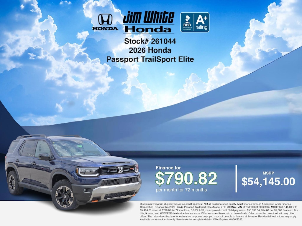 Our car payment calculator and estimator tools can help you understand these finance offers that leverage the benefits of Honda Financial Services, along with Honda vehicle incentives right now and current Honda Passport TrailSport Elite specials. Additionally, we offer 9 other Passport TrailSport Elite options for the best selection in Maumee. Call or drive in for Honda finance deals you can drive home today! Disclaimer: Disclaimer: Program eligibility based on credit approval. Not all customers will qualify. Must finance through American Honda Finance Corporation. Finance this 2026 Honda Passport TrailSport Elite (Model YF9H8TKNW, VIN 5FNYF9H81TB062383). MSRP $54,145.00 with $5,414.00 down at $790.82 for 72 months at 5.99% APR, on approved credit. Total payments: $56,939.04. $14.88 per $1,000 financed. Tax, title, license, and #DOCFEE dealer doc fee are extra. Offer assumes these paid at time of sale. Offer cannot be combined with any other offers. The rates described are for estimation purposes only; you may not be able to finance at this rate. Residential restrictions may apply. Available on in-stock units only. See dealer for complete details. Offer Expires: 04/30/2026.