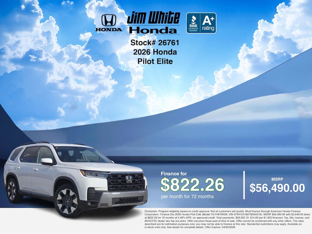 Our car payment calculator and estimator tools can help you understand these finance offers that leverage the benefits of Honda Financial Services, along with Honda vehicle incentives right now and current Honda Pilot Elite specials. Additionally, we offer 11 other Pilot Elite options for the best selection in Maumee. Call or drive in for Honda finance deals you can drive home today! Disclaimer: Disclaimer: Program eligibility based on credit approval. Not all customers will qualify. Must finance through American Honda Finance Corporation. Finance this 2026 Honda Pilot Elite (Model YG1H8TKNW, VIN 5FNYG1H82TB004216). MSRP $56,490.00 with $5,649.00 down at $822.26 for 72 months at 5.49% APR, on approved credit. Total payments: $59,202.72. $14.69 per $1,000 financed. Tax, title, license, and #DOCFEE dealer doc fee are extra. Offer assumes these paid at time of sale. Offer cannot be combined with any other offers. The rates described are for estimation purposes only; you may not be able to finance at this rate. Residential restrictions may apply. Available on in-stock units only. See dealer for complete details. Offer Expires: 04/30/2026.