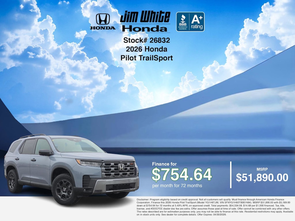 Our car payment calculator and estimator tools can help you understand these finance offers that leverage the benefits of Honda Financial Services, along with Honda vehicle incentives right now and current Honda Pilot TrailSport specials. Additionally, we offer 3 other Pilot TrailSport options for the best selection in Maumee. Call or drive in for Honda finance deals you can drive home today! Disclaimer: Disclaimer: Program eligibility based on credit approval. Not all customers will qualify. Must finance through American Honda Finance Corporation. Finance this 2026 Honda Pilot TrailSport (Model YG1H6TJW, VIN 5FNYG1H60TB007484). MSRP $51,890.00 with $5,189.00 down at $754.64 for 72 months at 5.49% APR, on approved credit. Total payments: $54,334.08. $14.68 per $1,000 financed. Tax, title, license, and #DOCFEE dealer doc fee are extra. Offer assumes these paid at time of sale. Offer cannot be combined with any other offers. The rates described are for estimation purposes only; you may not be able to finance at this rate. Residential restrictions may apply. Available on in-stock units only. See dealer for complete details. Offer Expires: 04/30/2026.