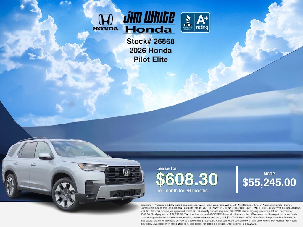 These offers leverage the benefits of Honda Financial Services, along with current Honda incentives, Honda Pilot Elite specials, and tax incentives available on electric vehicles. Additionally, we offer 12 other Pilot Elite options for the best selection in Maumee. Call or drive in for competitive Honda lease offers you can drive home today, like this stunning 2026 Honda Pilot with lease options near Maumee! This Pilot is also available for sale near Toledo, Perrysburg, and Waterville. These Honda lease specials end 4/30/2026 Disclaimer: Disclaimer: Program eligibility based on credit approval. Not all customers will qualify. Must finance through American Honda Finance Corporation. Lease this 2026 Honda Pilot Elite (Model YG1H8TKNW; VIN 5FNYG1H87TB012571). MSRP $55,245.00. With $5,524.00 down at $608.30 for 36 months, on approved credit. $0.00 security deposit required. $6,132.30 due at signing - includes 1st mo. payment of $608.30. Total payments: $21,898.80. Tax, title, license, and #DOCFEE dealer doc fee are extra. Offer assumes these paid at time of sale. Lessee responsible for maintenance, repairs, excessive wear and tear, and $0.20/mile over 10000 miles/year. Early lease termination fee may apply. Option to purchase vehicle at lease end is $35,356.80. Offer cannot be combined with any other offers. Residential restrictions may apply. Available on in-stock units only. See dealer for complete details. Offer Expires: 04/30/2026.