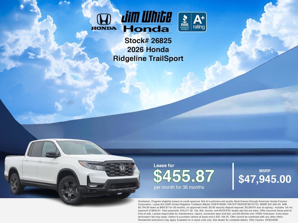 These offers leverage the benefits of Honda Financial Services, along with current Honda incentives, Honda Ridgeline TrailSport specials, and tax incentives available on electric vehicles. Additionally, we offer 5 other Ridgeline TrailSport options for the best selection in Maumee. Call or drive in for competitive Honda lease offers you can drive home today, like this stunning 2026 Honda Ridgeline with lease options near Maumee! This Ridgeline is also available for sale near Toledo, Perrysburg, and Waterville. These Honda lease specials end 4/30/2026 Disclaimer: Disclaimer: Program eligibility based on credit approval. Not all customers will qualify. Must finance through American Honda Finance Corporation. Lease this 2026 Honda Ridgeline TrailSport (Model YK3F6TKNW; VIN 5FPYK3F69TB019170). MSRP $47,945.00. With $4,794.00 down at $455.87 for 36 months, on approved credit. $0.00 security deposit required. $5,249.87 due at signing - includes 1st mo. payment of $455.87. Total payments: $16,411.32. Tax, title, license, and #DOCFEE dealer doc fee are extra. Offer assumes these paid at time of sale. Lessee responsible for maintenance, repairs, excessive wear and tear, and $0.20/mile over 10000 miles/year. Early lease termination fee may apply. Option to purchase vehicle at lease end is $31,164.25. Offer cannot be combined with any other offers. Residential restrictions may apply. Available on in-stock units only. See dealer for complete details. Offer Expires: 04/30/2026.