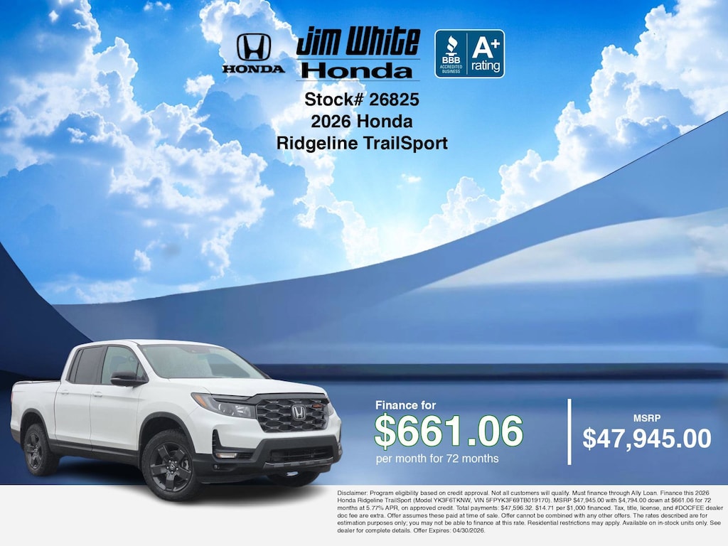 Our car payment calculator and estimator tools can help you understand these finance offers that leverage the benefits of Honda Financial Services, along with Honda vehicle incentives right now and current Honda Ridgeline TrailSport specials. Additionally, we offer 5 other Ridgeline TrailSport options for the best selection in Maumee. Call or drive in for Honda finance deals you can drive home today! Disclaimer: Disclaimer: Program eligibility based on credit approval. Not all customers will qualify. Must finance through Ally Loan. Finance this 2026 Honda Ridgeline TrailSport (Model YK3F6TKNW, VIN 5FPYK3F69TB019170). MSRP $47,945.00 with $4,794.00 down at $661.06 for 72 months at 5.77% APR, on approved credit. Total payments: $47,596.32. $14.71 per $1,000 financed. Tax, title, license, and #DOCFEE dealer doc fee are extra. Offer assumes these paid at time of sale. Offer cannot be combined with any other offers. The rates described are for estimation purposes only; you may not be able to finance at this rate. Residential restrictions may apply. Available on in-stock units only. See dealer for complete details. Offer Expires: 04/30/2026.