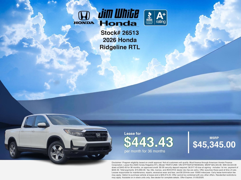 These offers leverage the benefits of Honda Financial Services, along with current Honda incentives, Honda Ridgeline RTL specials, and tax incentives available on electric vehicles. Additionally, we offer 2 other Ridgeline RTL options for the best selection in Maumee. Call or drive in for competitive Honda lease offers you can drive home today, like this stunning 2026 Honda Ridgeline with lease options near Maumee! This Ridgeline is also available for sale near Toledo, Perrysburg, and Waterville. These Honda lease specials end 1/5/2026 Disclaimer: Disclaimer: Program eligibility based on credit approval. Not all customers will qualify. Must finance through American Honda Finance Corporation. Lease this 2026 Honda Ridgeline RTL (Model YK3F5TJNW; VIN 5FPYK3F54TB006530). MSRP $45,345.00. With $4,534.00 down at $443.43 for 36 months, on approved credit. $0.00 security deposit required. $4,977.43 due at signing - includes 1st mo. payment of $443.43. Total payments: $15,963.48. Tax, title, license, and #DOCFEE dealer doc fee are extra. Offer assumes these paid at time of sale. Lessee responsible for maintenance, repairs, excessive wear and tear, and $0.20/mile over 10000 miles/year. Early lease termination fee may apply. Option to purchase vehicle at lease end is $29,474.25. Offer cannot be combined with any other offers. Residential restrictions may apply. Available on in-stock units only. See dealer for complete details. Offer Expires: 01/05/2026.
