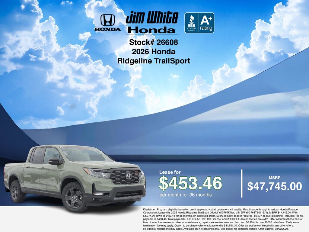 These offers leverage the benefits of Honda Financial Services, along with current Honda incentives, Honda Ridgeline TrailSport specials, and tax incentives available on electric vehicles. Additionally, we offer 2 other Ridgeline TrailSport options for the best selection in Maumee. Call or drive in for competitive Honda lease offers you can drive home today, like this stunning 2026 Honda Ridgeline with lease options near Maumee! This Ridgeline is also available for sale near Toledo, Perrysburg, and Waterville. These Honda lease specials end 3/2/2026 Disclaimer: Disclaimer: Program eligibility based on credit approval. Not all customers will qualify. Must finance through American Honda Finance Corporation. Lease this 2026 Honda Ridgeline TrailSport (Model YK3F6TKNW; VIN 5FPYK3F68TB011674). MSRP $47,745.00. With $4,774.00 down at $453.46 for 36 months, on approved credit. $0.00 security deposit required. $5,227.46 due at signing - includes 1st mo. payment of $453.46. Total payments: $16,324.56. Tax, title, license, and #DOCFEE dealer doc fee are extra. Offer assumes these paid at time of sale. Lessee responsible for maintenance, repairs, excessive wear and tear, and $0.20/mile over 10000 miles/year. Early lease termination fee may apply. Option to purchase vehicle at lease end is $31,511.70. Offer cannot be combined with any other offers. Residential restrictions may apply. Available on in-stock units only. See dealer for complete details. Offer Expires: 03/02/2026.