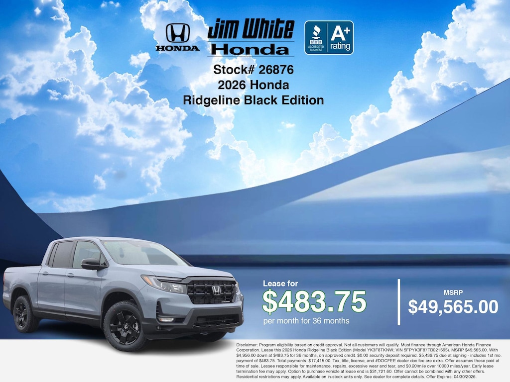 These offers leverage the benefits of Honda Financial Services, along with current Honda incentives, Honda Ridgeline Black Edition specials, and tax incentives available on electric vehicles. Additionally, we offer 9 other Ridgeline Black Edition options for the best selection in Maumee. Call or drive in for competitive Honda lease offers you can drive home today, like this stunning 2026 Honda Ridgeline with lease options near Maumee! This Ridgeline is also available for sale near Toledo, Perrysburg, and Waterville. These Honda lease specials end 4/30/2026 Disclaimer: Disclaimer: Program eligibility based on credit approval. Not all customers will qualify. Must finance through American Honda Finance Corporation. Lease this 2026 Honda Ridgeline Black Edition (Model YK3F8TKNW; VIN 5FPYK3F87TB021565). MSRP $49,565.00. With $4,956.00 down at $483.75 for 36 months, on approved credit. $0.00 security deposit required. $5,439.75 due at signing - includes 1st mo. payment of $483.75. Total payments: $17,415.00. Tax, title, license, and #DOCFEE dealer doc fee are extra. Offer assumes these paid at time of sale. Lessee responsible for maintenance, repairs, excessive wear and tear, and $0.20/mile over 10000 miles/year. Early lease termination fee may apply. Option to purchase vehicle at lease end is $31,721.60. Offer cannot be combined with any other offers. Residential restrictions may apply. Available on in-stock units only. See dealer for complete details. Offer Expires: 04/30/2026.