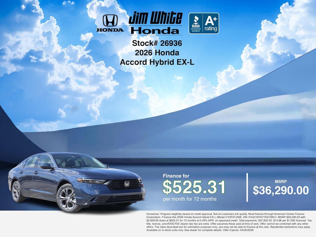 Discover Honda Accord Hybrid EX-L Exceptional Savings at Jim White Honda!