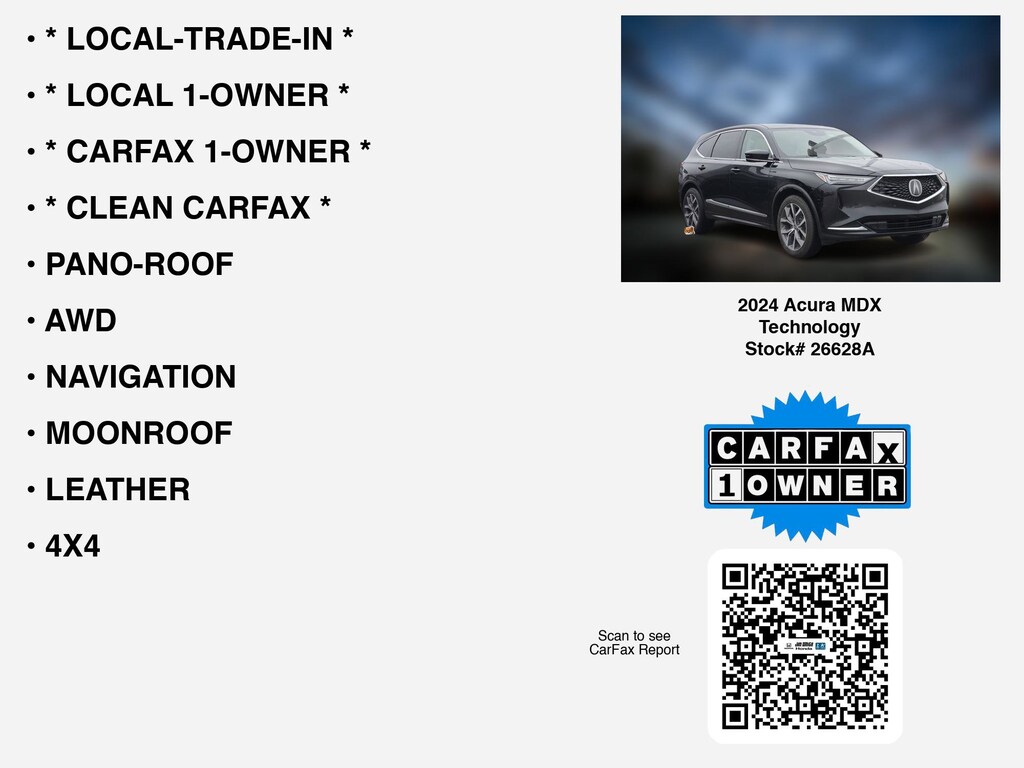 Please call 419-740-4925 anytime! for more info on this 2024 Acura MDX Technology. This Carfax 1 owner car for sale is packed with premium features like * CARFAX 1-OWNER *, * LOCAL-TRADE-IN *, * CLEAN CARFAX *, * LOCAL 1-OWNER *, 4X4, NAVIGATION, LEATHER, MOONROOF, PANO-ROOF, AWD, APPLE CARPLAY, WIRELESS PHONE CHARGER, 3RD ROW SEAT, HEATED SEATS, ANDROID AUTO, LANE-DEPARTURE WARNING, REAR A/C, BACKUP CAMERA, ALLOY-WHEELS, HOMELINK, BLIND SPOT MONITORING, BLUETOOTH, BACKUP-SENSORS, WiFi Hotspot, Remote entry, SiriusXM, usb, Dual Power Seats that Toledo and Perrysburg drivers expect.