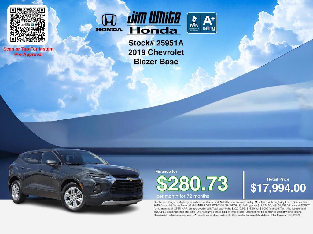 Disclaimer: Disclaimer: Program eligibility based on credit approval. Not all customers will qualify. Must finance through Ally Loan. Finance this 2019 Chevrolet Blazer Base (Model 1NR26, VIN 3GNKBGRS6KS653712). Selling price $17,994.00, with $1,799.00 down at $280.73 for 72 months at 7.59% APR, on approved credit. Total payments: $20,212.56. $15.60 per $1,000 financed. Tax, title, license, and #DOCFEE dealer doc fee are extra. Offer assumes these paid at time of sale. Offer cannot be combined with any other offers. Residential restrictions may apply. Available on in-stock units only. See dealer for complete details. Offer Expires: 11/30/2025.