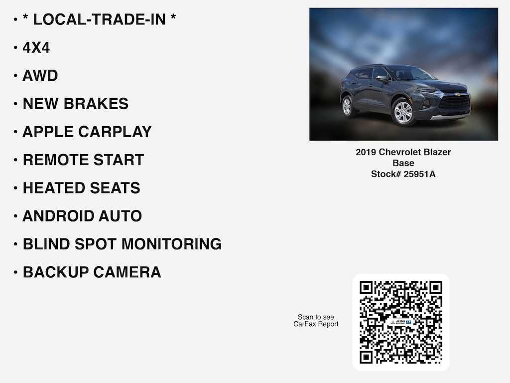 Please call 419-740-4925 anytime! for more info on this 2019 Chevrolet Blazer Base. * LOCAL-TRADE-IN *, 4X4, NEW FRONT BRAKE PADS AND ROTORS, AWD, HEATED SEATS, APPLE CARPLAY, REMOTE START, ANDROID AUTO, HOMELINK, REAR A/C, BACKUP CAMERA, BLIND SPOT MONITORING, BLUETOOTH, WiFi Hotspot, SiriusXM, Remote entry, usb that Toledo and Perrysburg drivers expect.